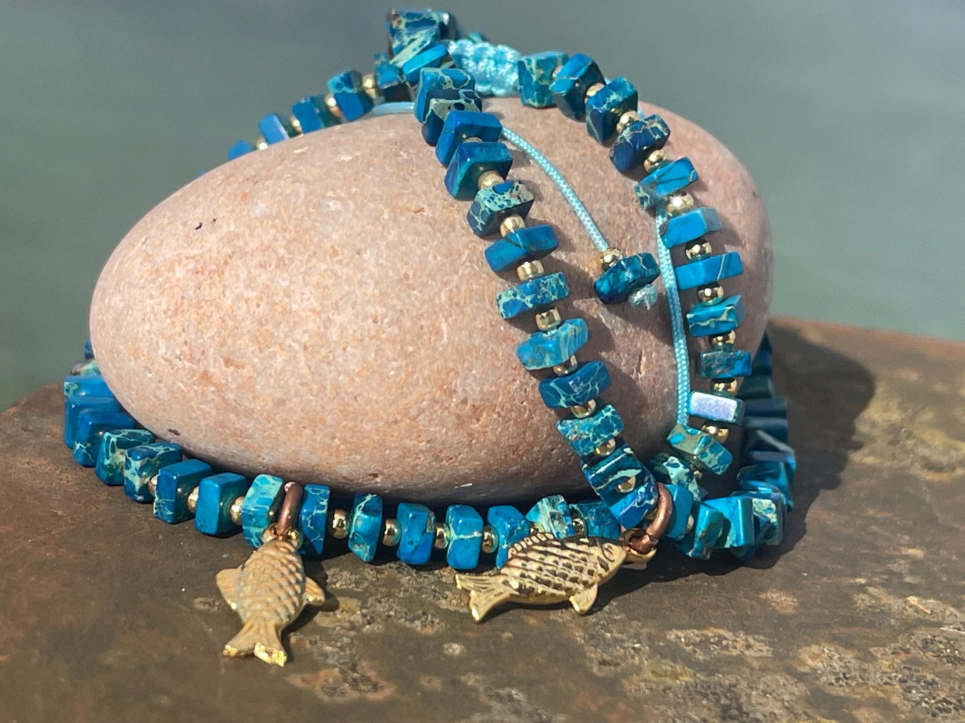 This is handmade jasper bracelet showcasing a little brass fish. It is hosted on an adjustable cord to make it easy to get in and off and to suit a wide range of wrist sizes.