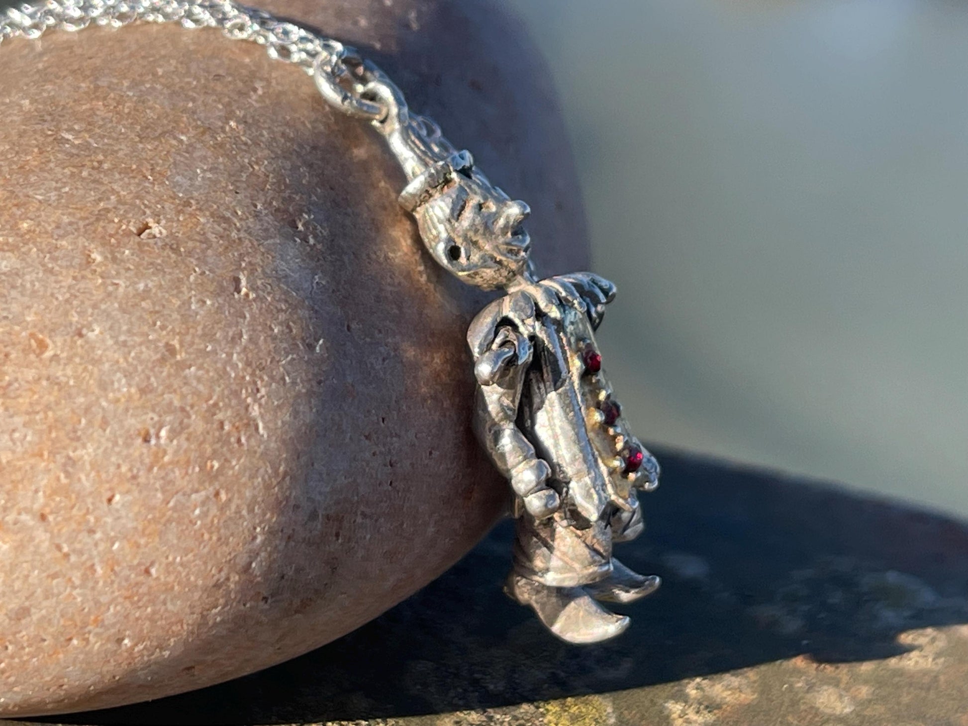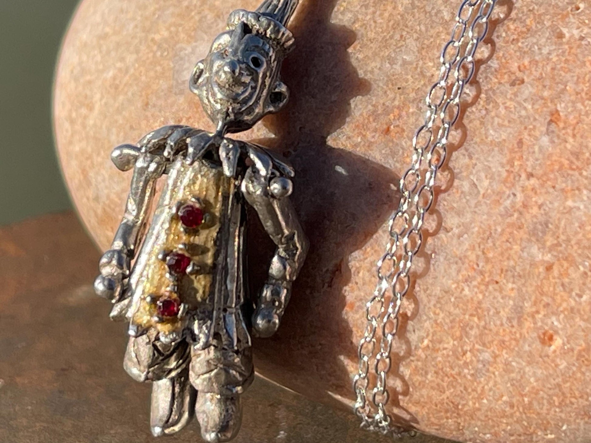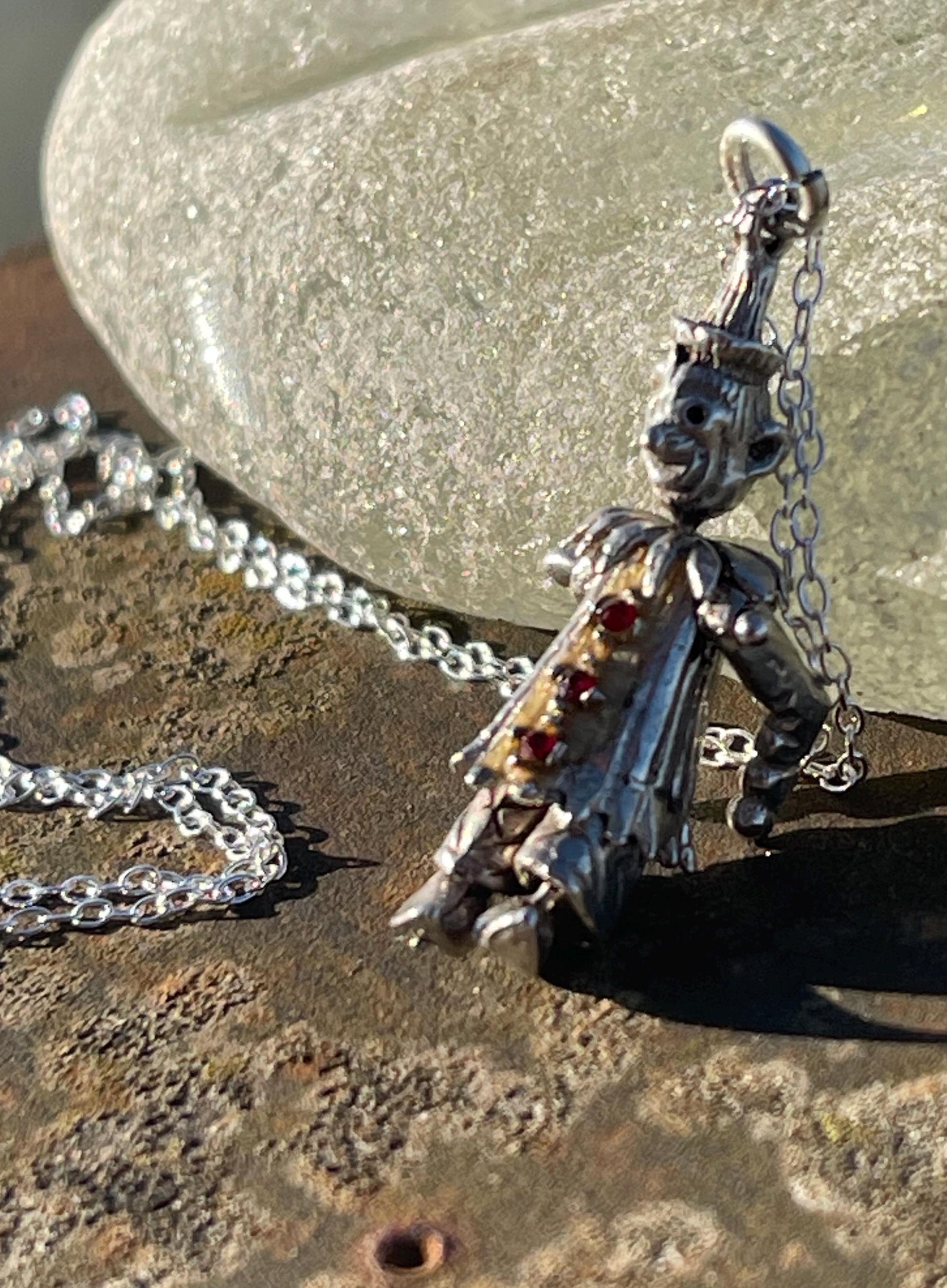 This is a very beautiful contage clown necklace made from silver and embellished with beautiful pieces of glass. The clown has moving parts and I have hung him on a recycled sterling silver 18’ chain.