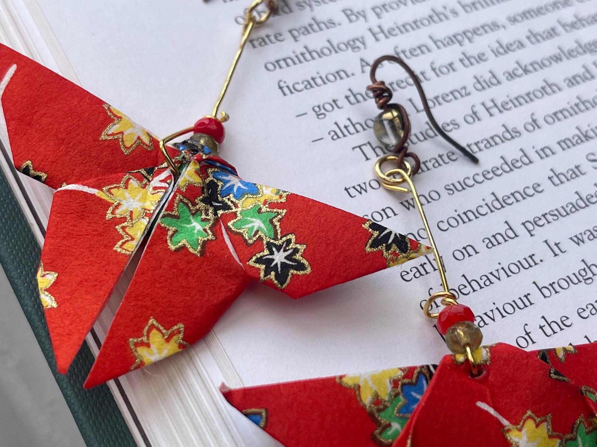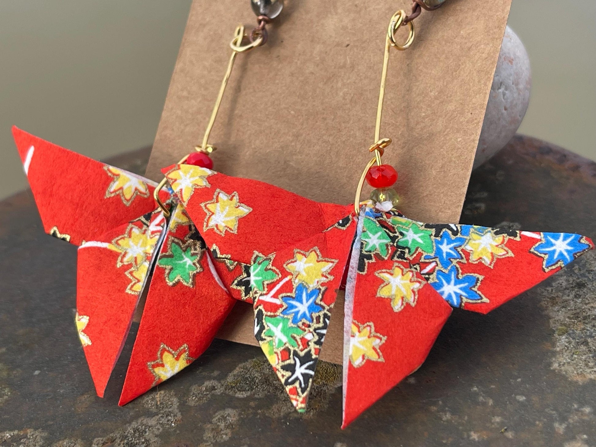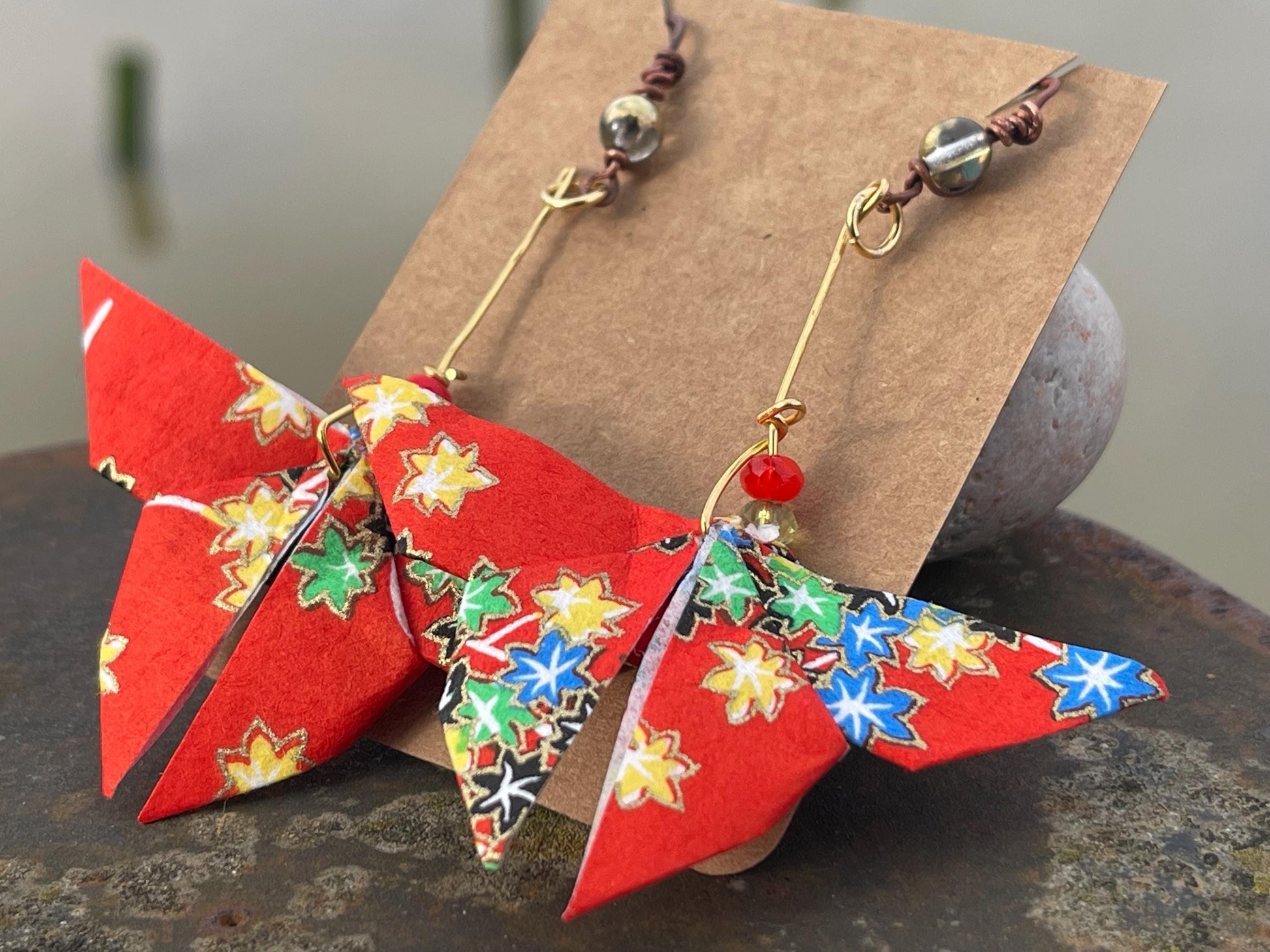 Handmade origami (paper) butterfly’s hosted on recycled brass and vintage beading. The ear hooks are made from burnt recycled copper and showcase a beautiful glass bead. A beautiful unique gift for yourself or a loved one.