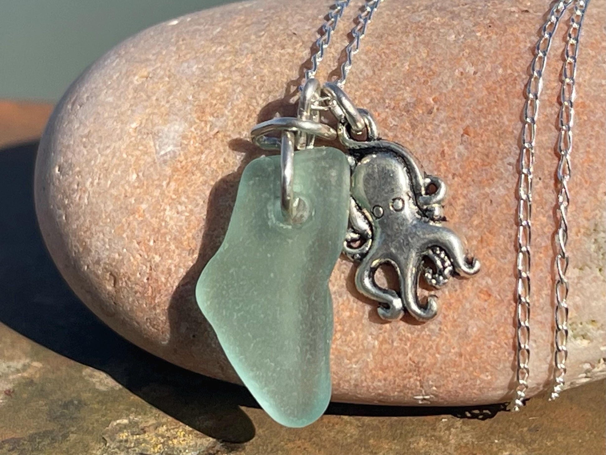 Eco friendly aqua sea glass necklace on a sterling silver chain showcasing a little octopus. Octopus pendant, eco friendly jewellery.