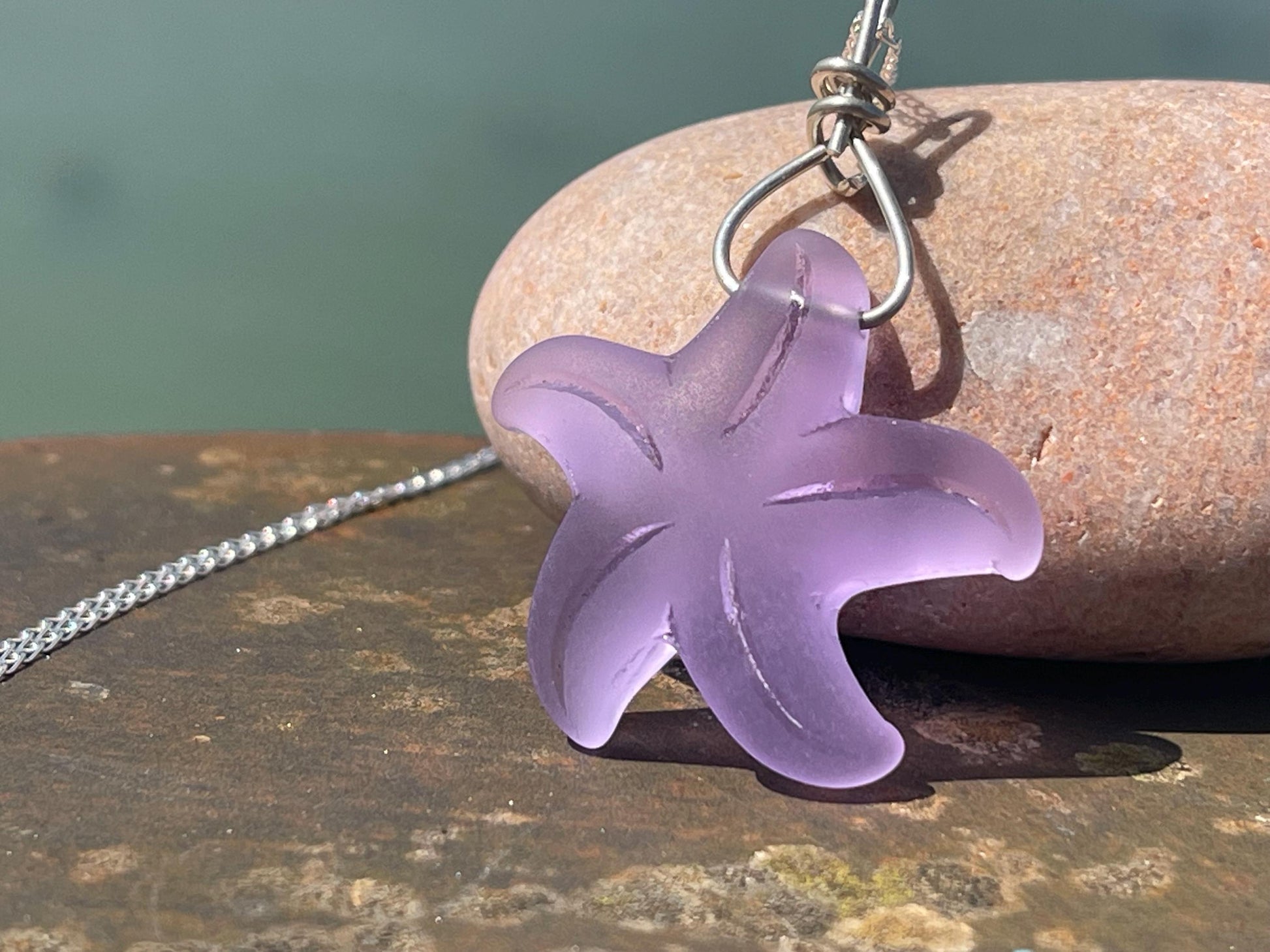 Eco friendly glass necklace on a sterling silver chain showcasing a pink starfish pendant, starfish necklace, ethical jewellery