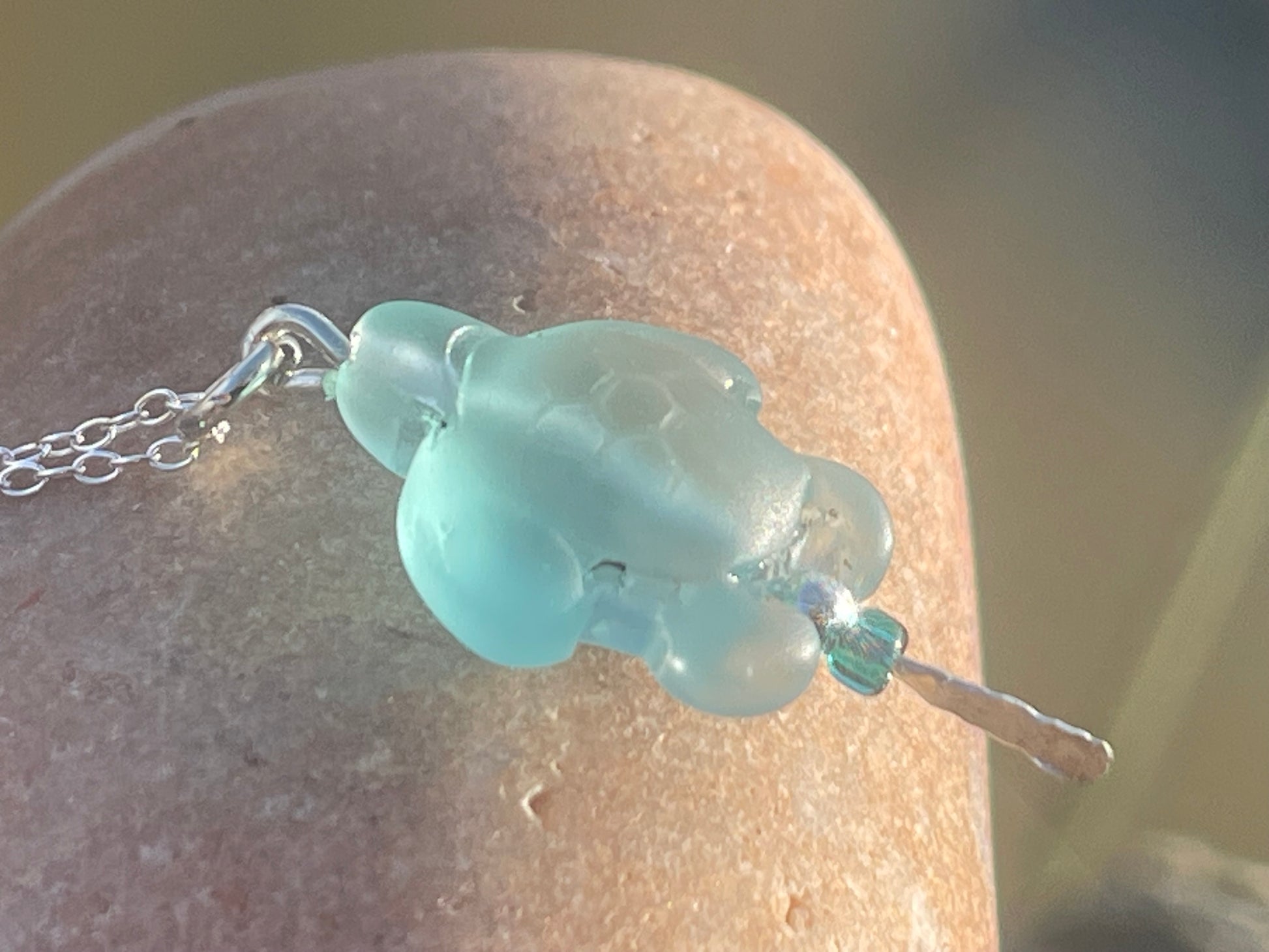 Eco friendly glass turtle necklace on a recycled sterling silver chain. Aqua turtle pendant. Eco friendly necklace, ethical jewellery.