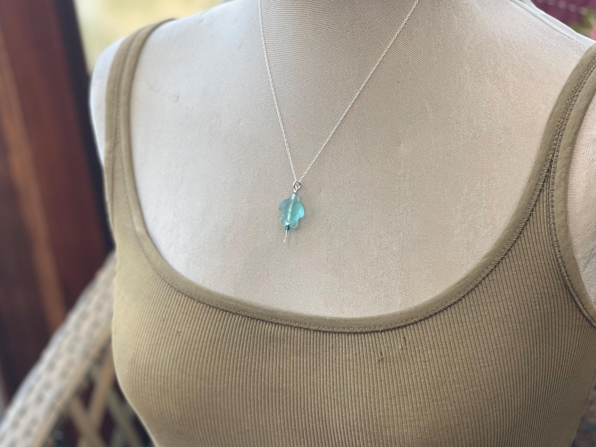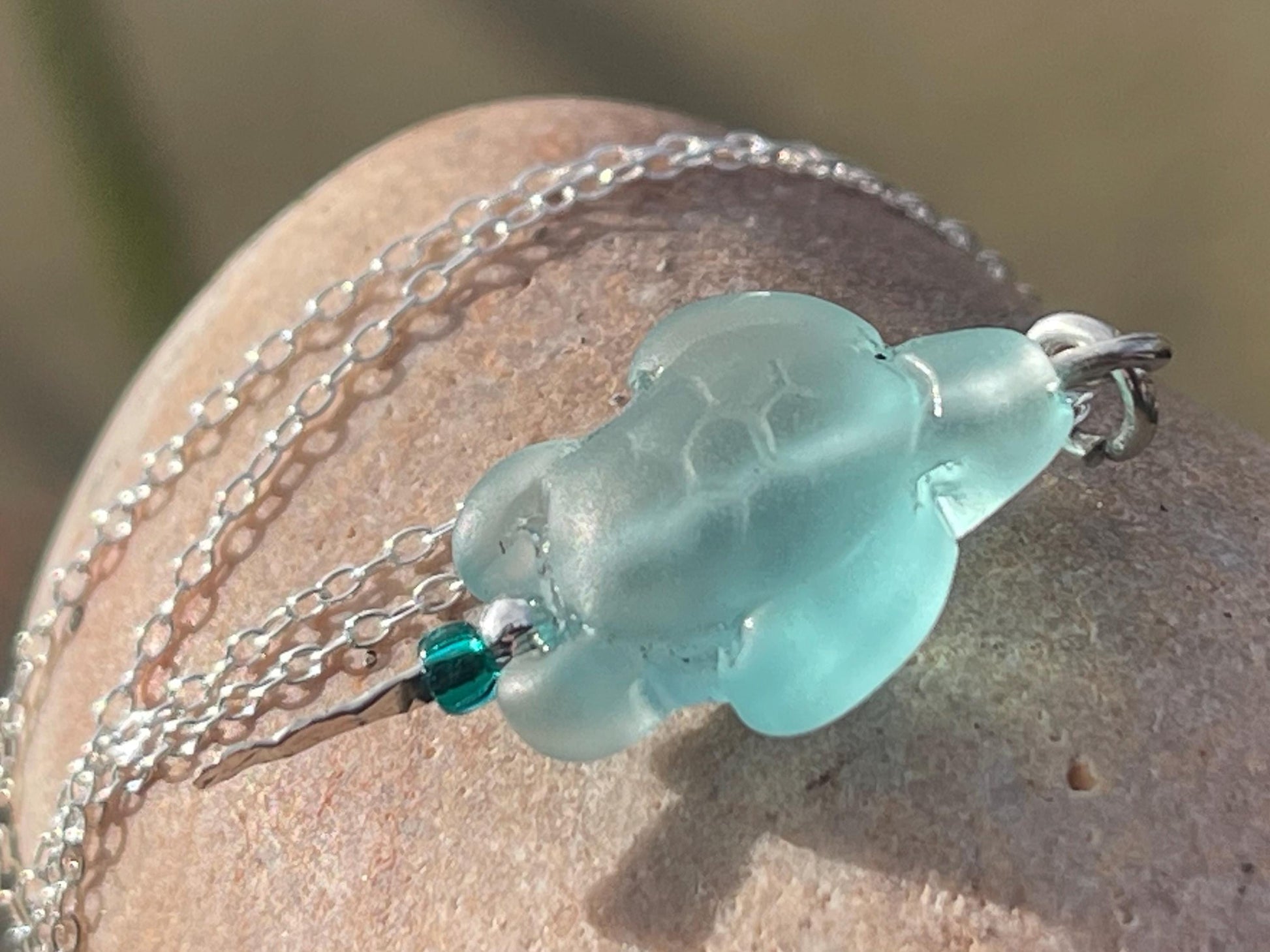Beautiful recycled aqua glass necklace hung on recycled sterling silver. I have hung the piece on a recycled sterling silver chain (18"/45cm in length).