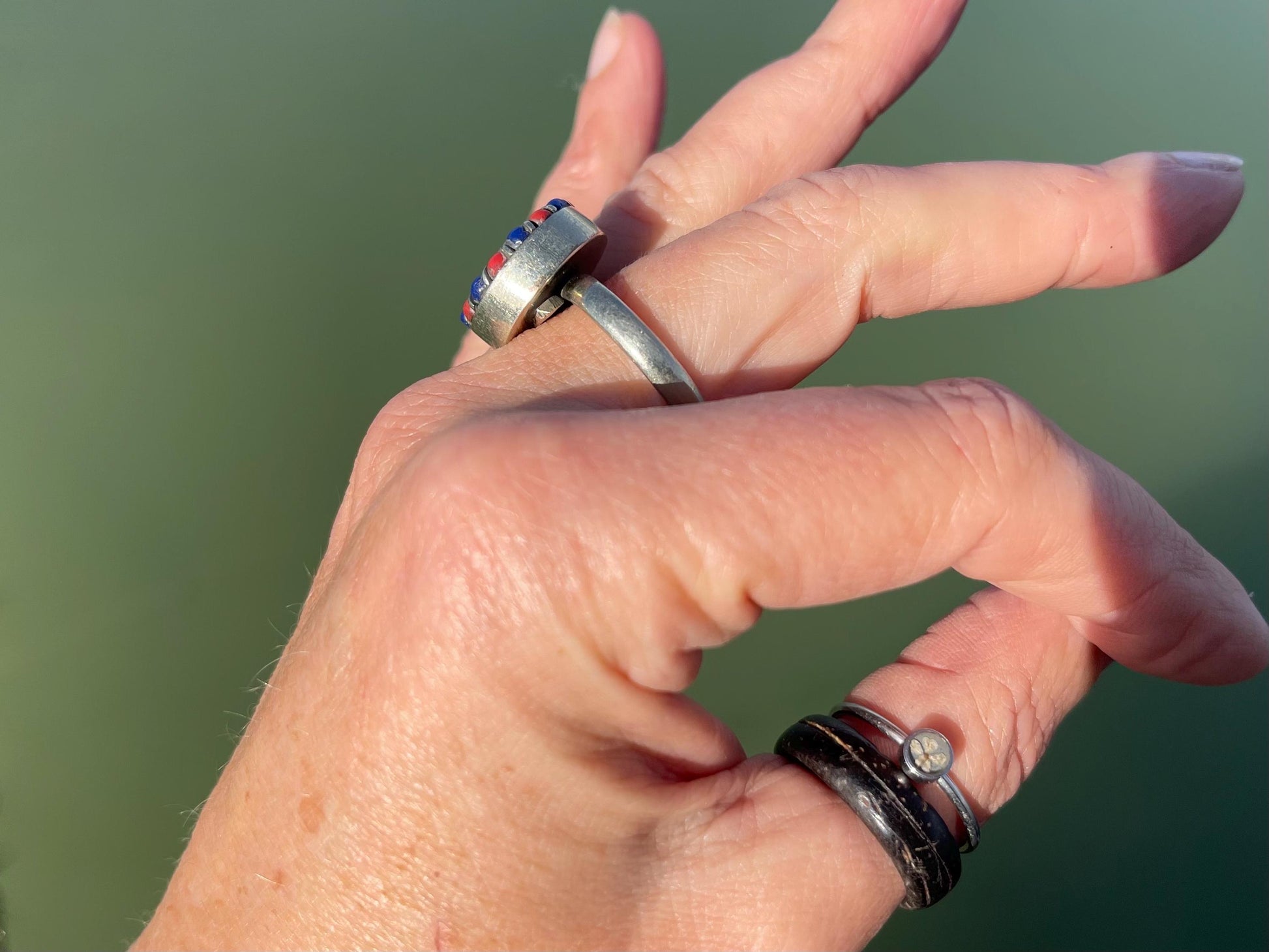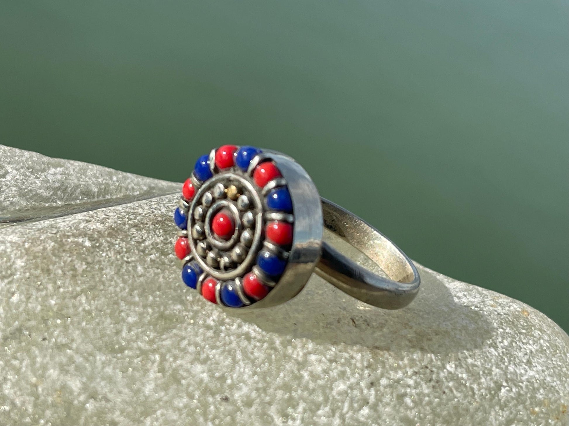 Fabulous vintage turquoise ring, silver & red ring, boho vintage jewellery, ethical jewellery, gypsy ring. Eco friendly jewellery.