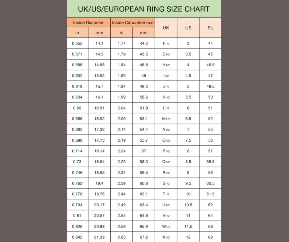 Size 6 US or L.5 UK. To work out your ring size Take a length of floss or string and wrap it around the base of your finger. Mark where the floss or string first overlaps with a pen. Stretch the length of string out along a ruler or measuring tape, and take down the length in millimetres. You can then scroll left (within my product pictures) to see my ring size chart and find out what size you are. Easy!