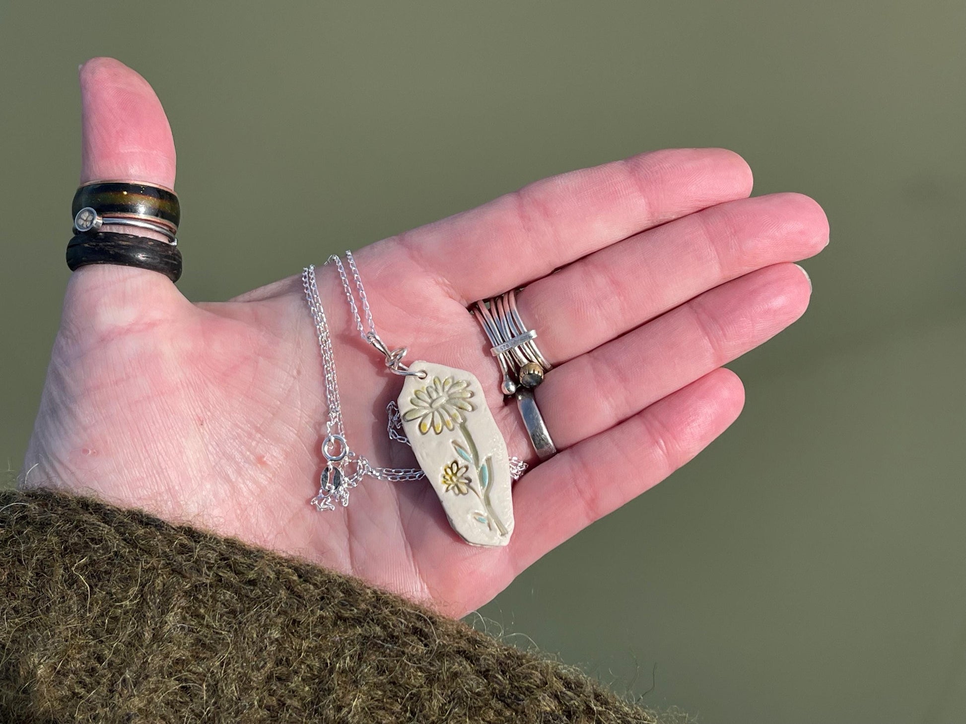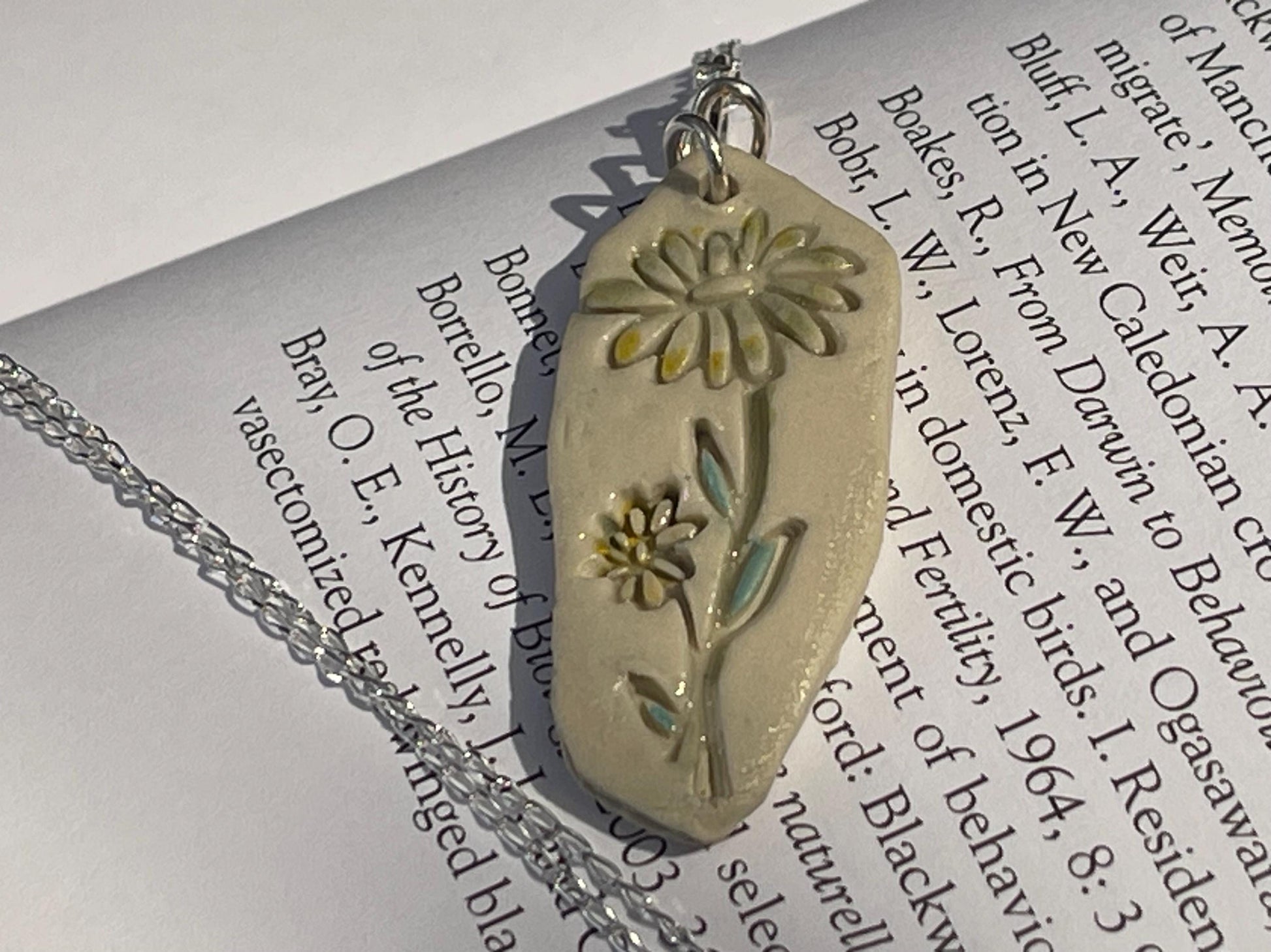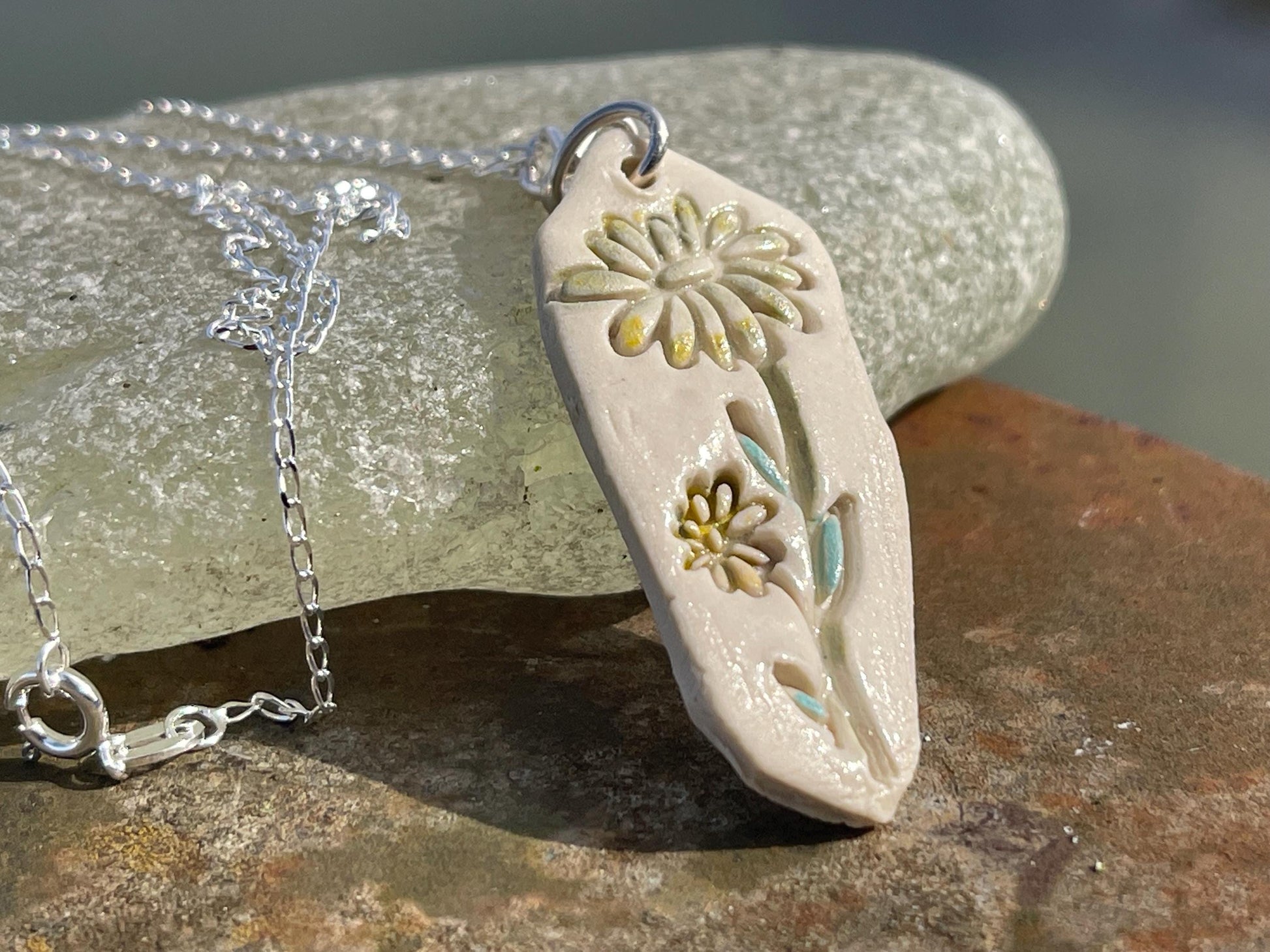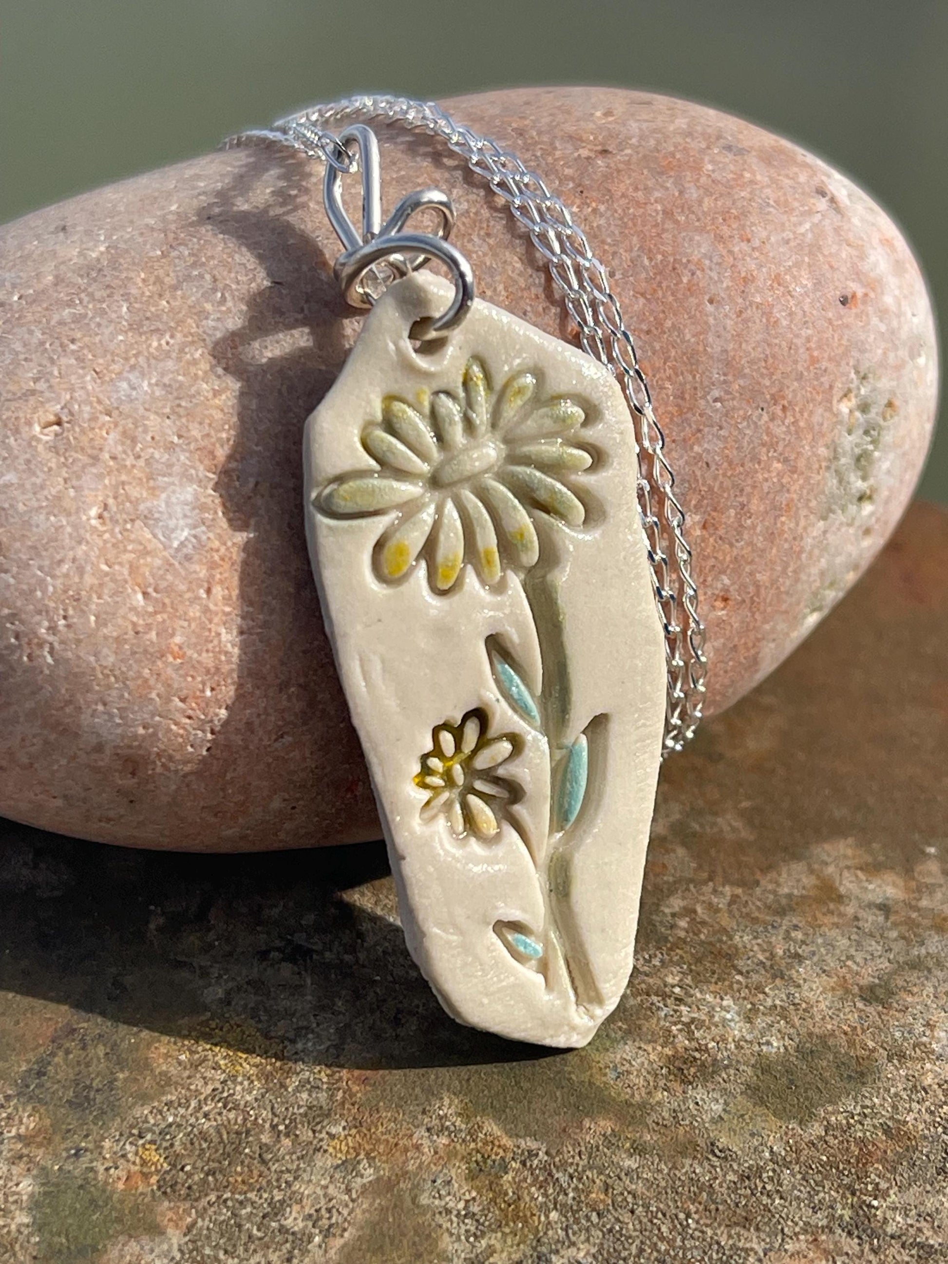 Handmade daisy necklace. Eco friendly jewellery. Ethical pendants made with waste clay and recycled sterling silver. Ethical jewellery.