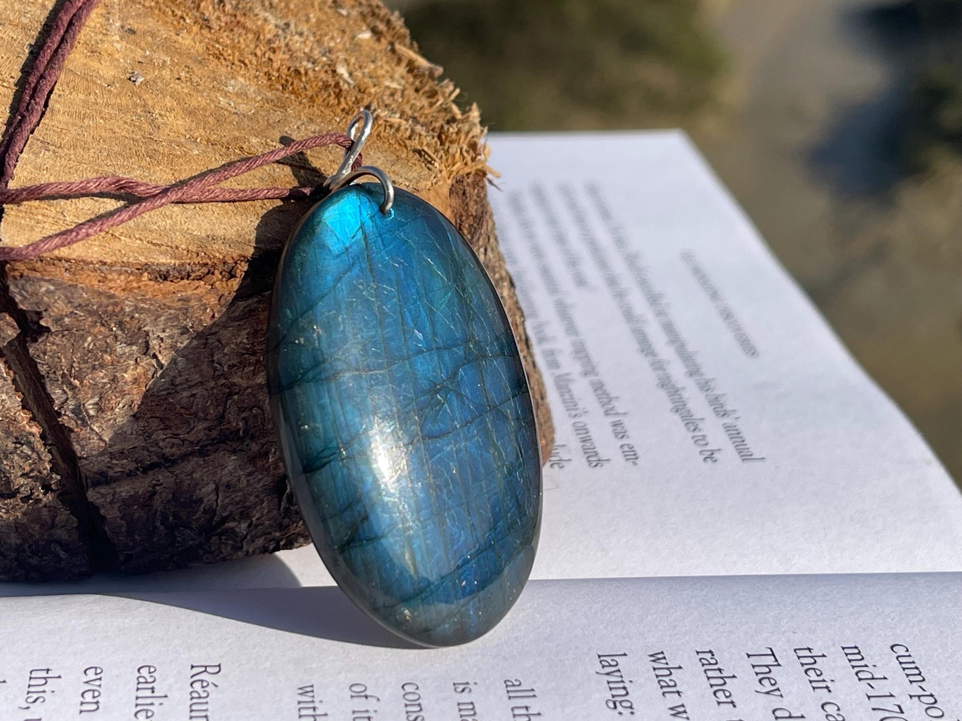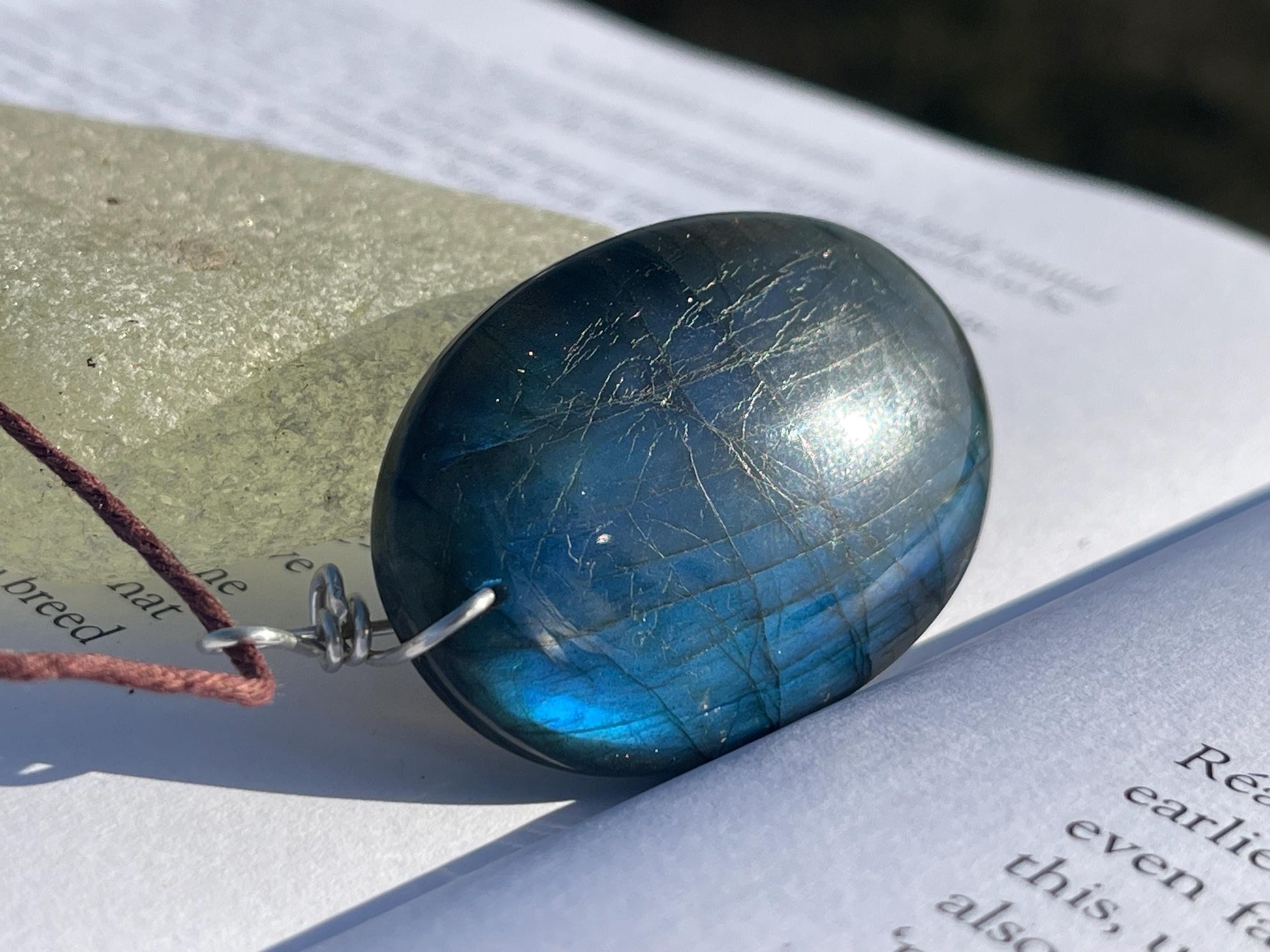 Stunning blue labradorite. It looks very different in different lights with beautiful shimmery colours coming through in the sunshine or under lights as the piece moves.