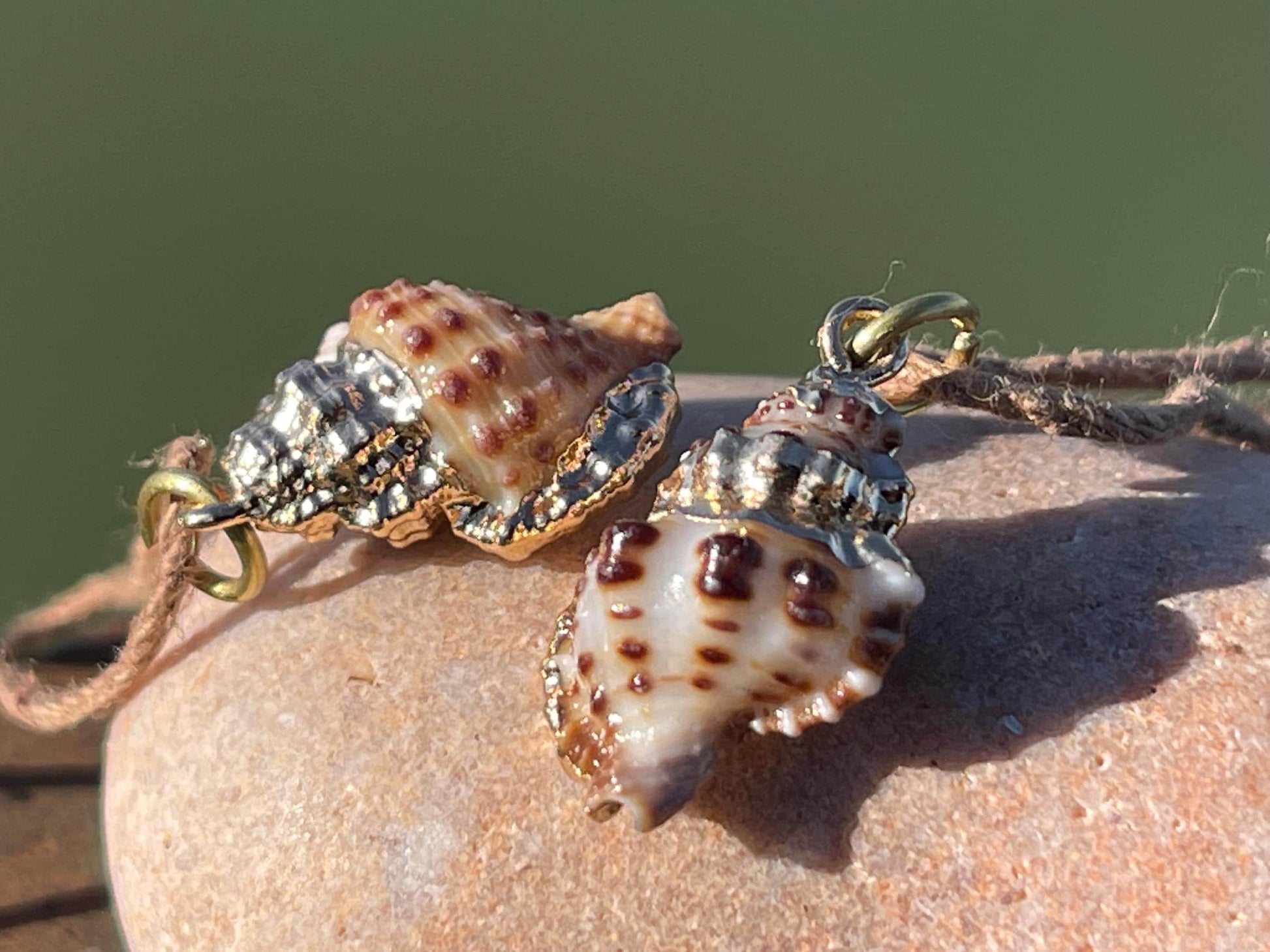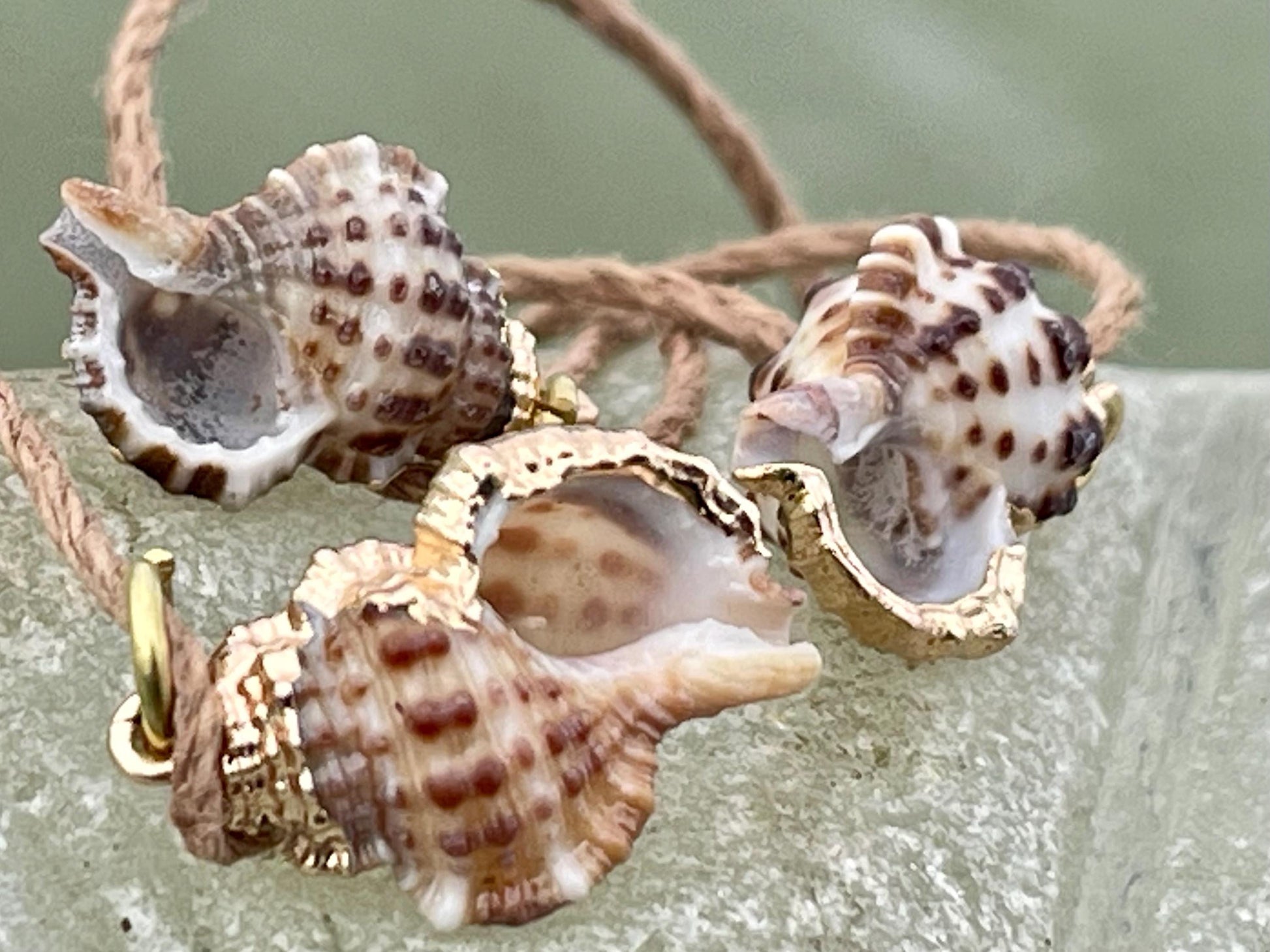 Beautiful little shells. Painted in gold and held on recycled brass and sustainable hemp. Tie at your preferred length.
