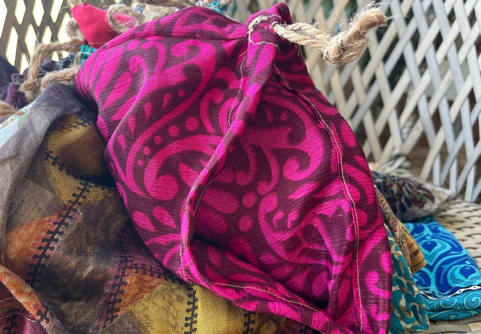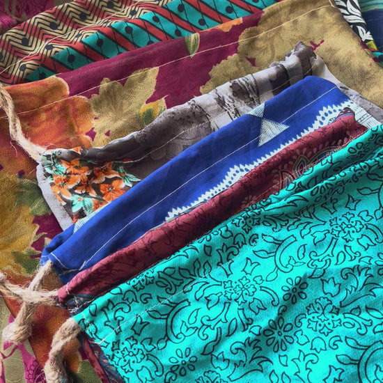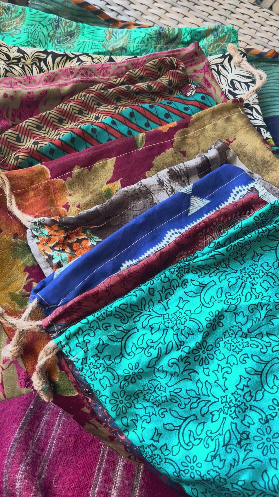Small & medium recycled sari bags. Eco friendly wrapping option. Recycled bags for gifts. Recycled gift bags. Ethical draw string bags.