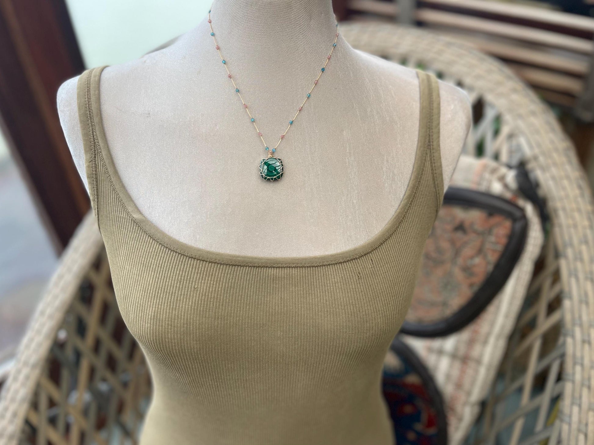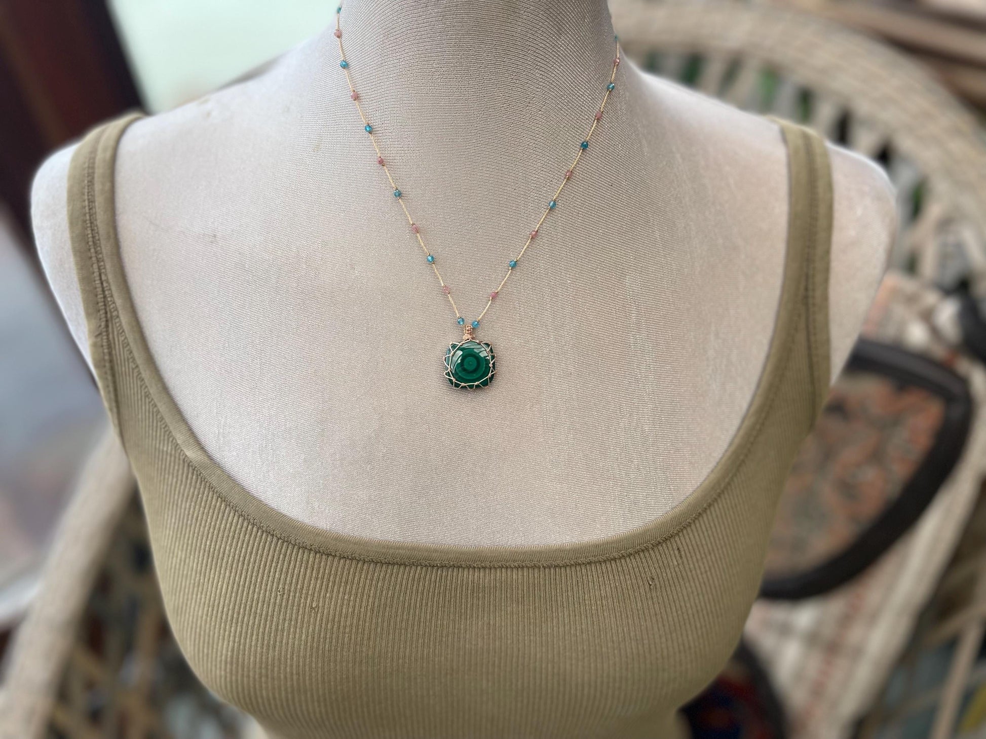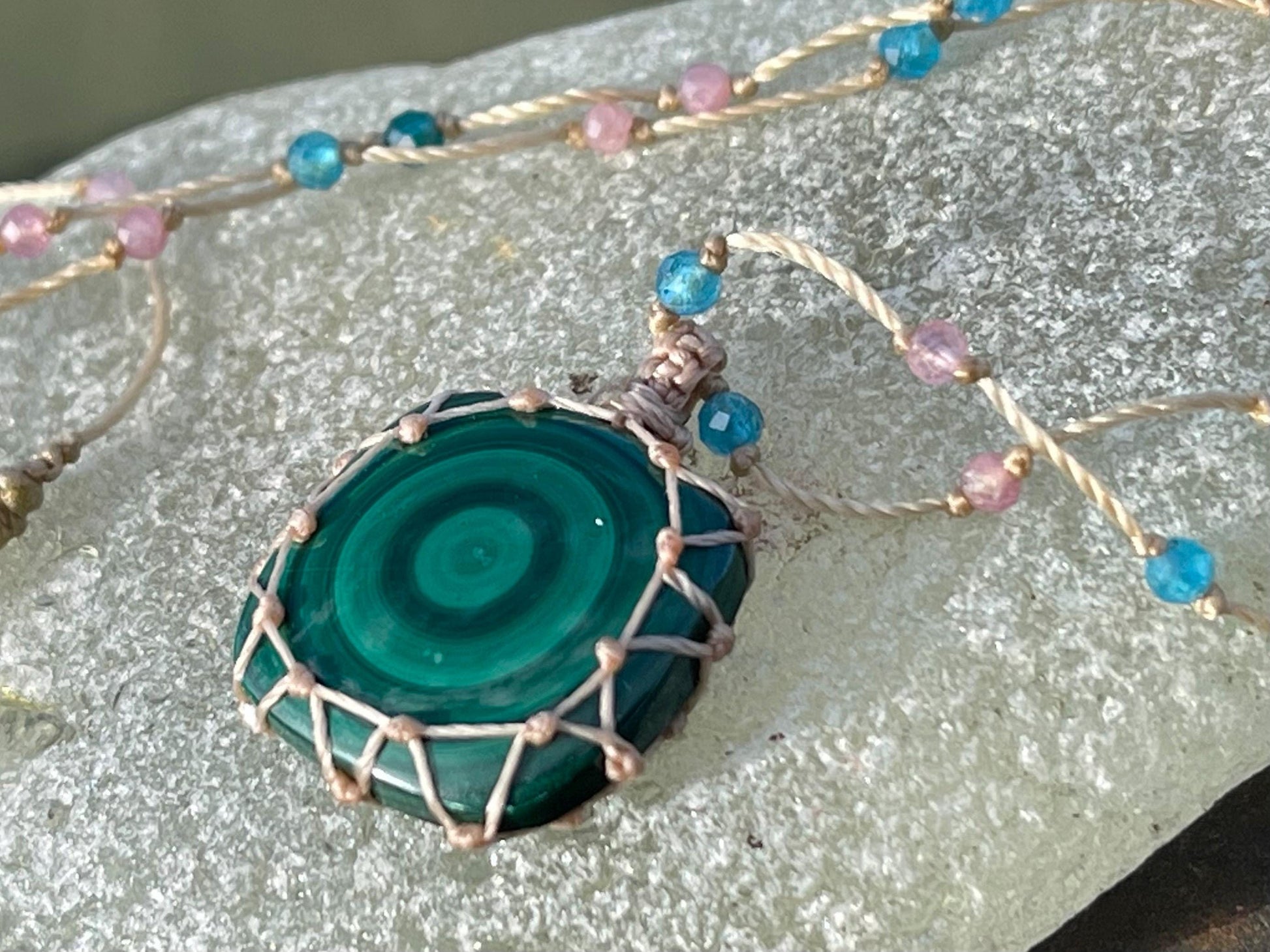 This is a beautiful ethically sourced malachite gemstone, macrame wrapped and held on a light cord interspersed with dainty beading.