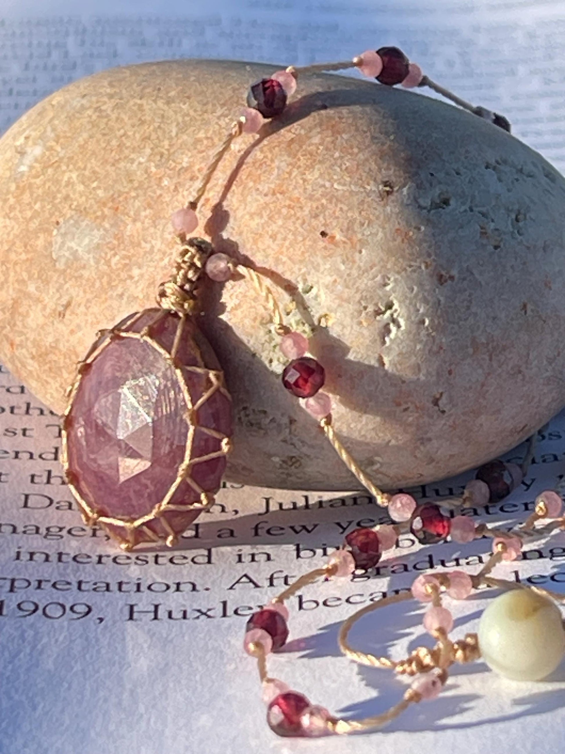 This is a beautiful and unique amethyst necklace, macrame wrapped and held on a light cord interspersed with dainty beading.