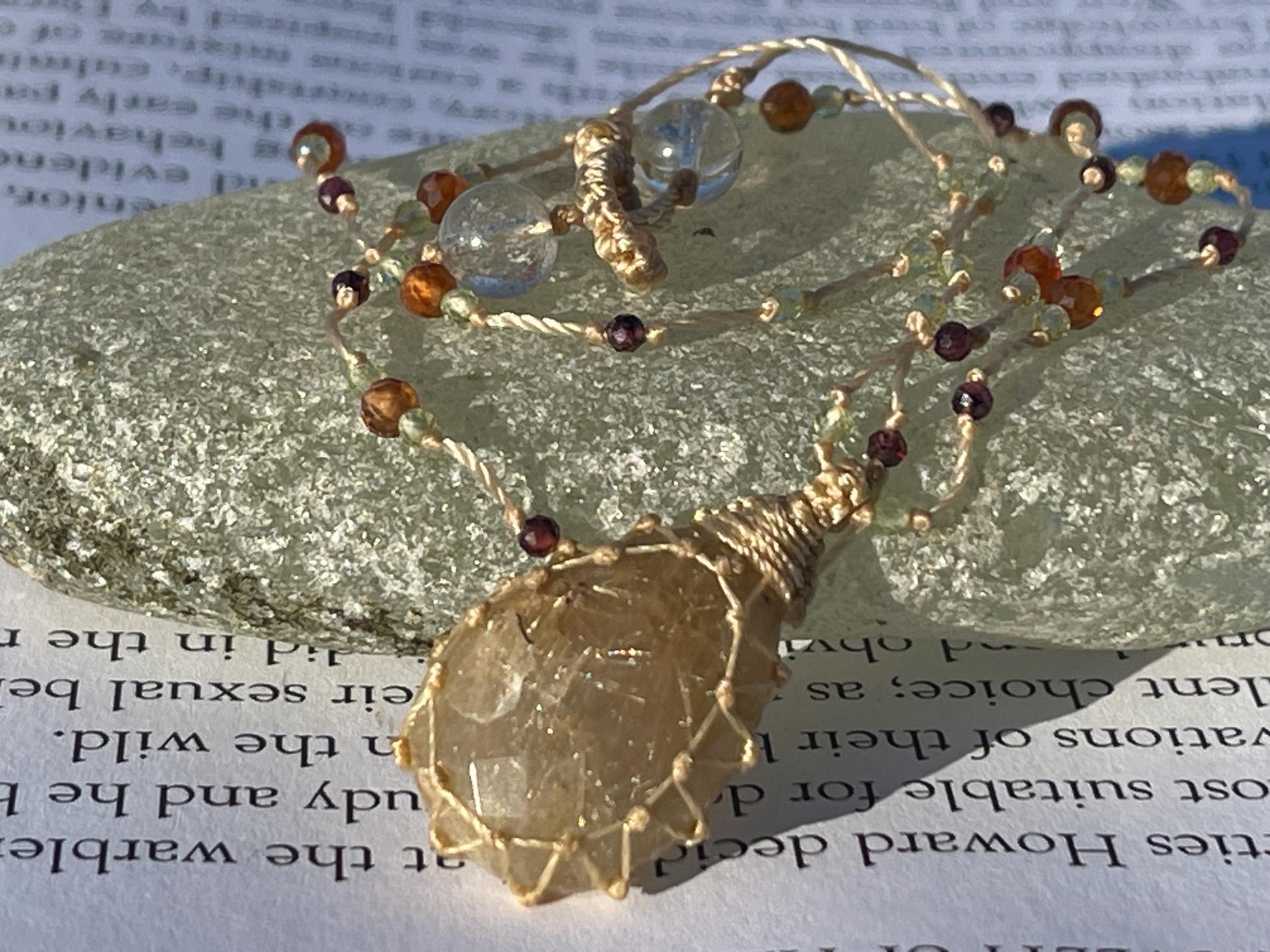 This is a beautiful and unique rutile quartz necklace, macrame wrapped and held on a light cord interspersed with dainty beading.