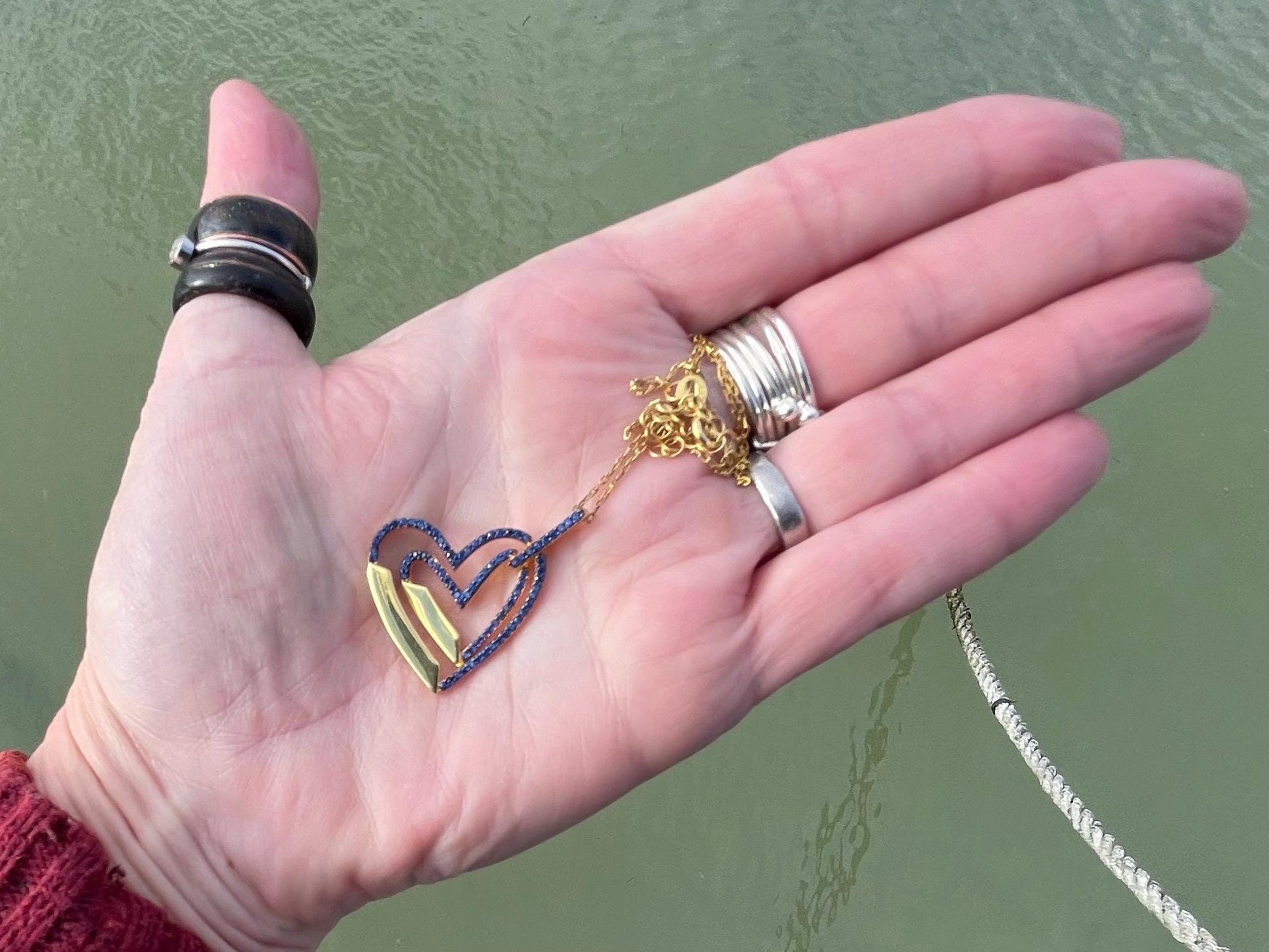 Vintage heart necklace, gold heart jewellery, blue hearts, ethical jewellery. Eco friendly jewellery. Ethical jewellery. Romantic gifts.