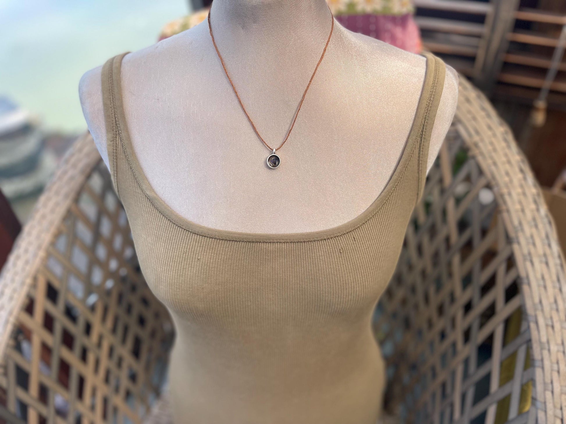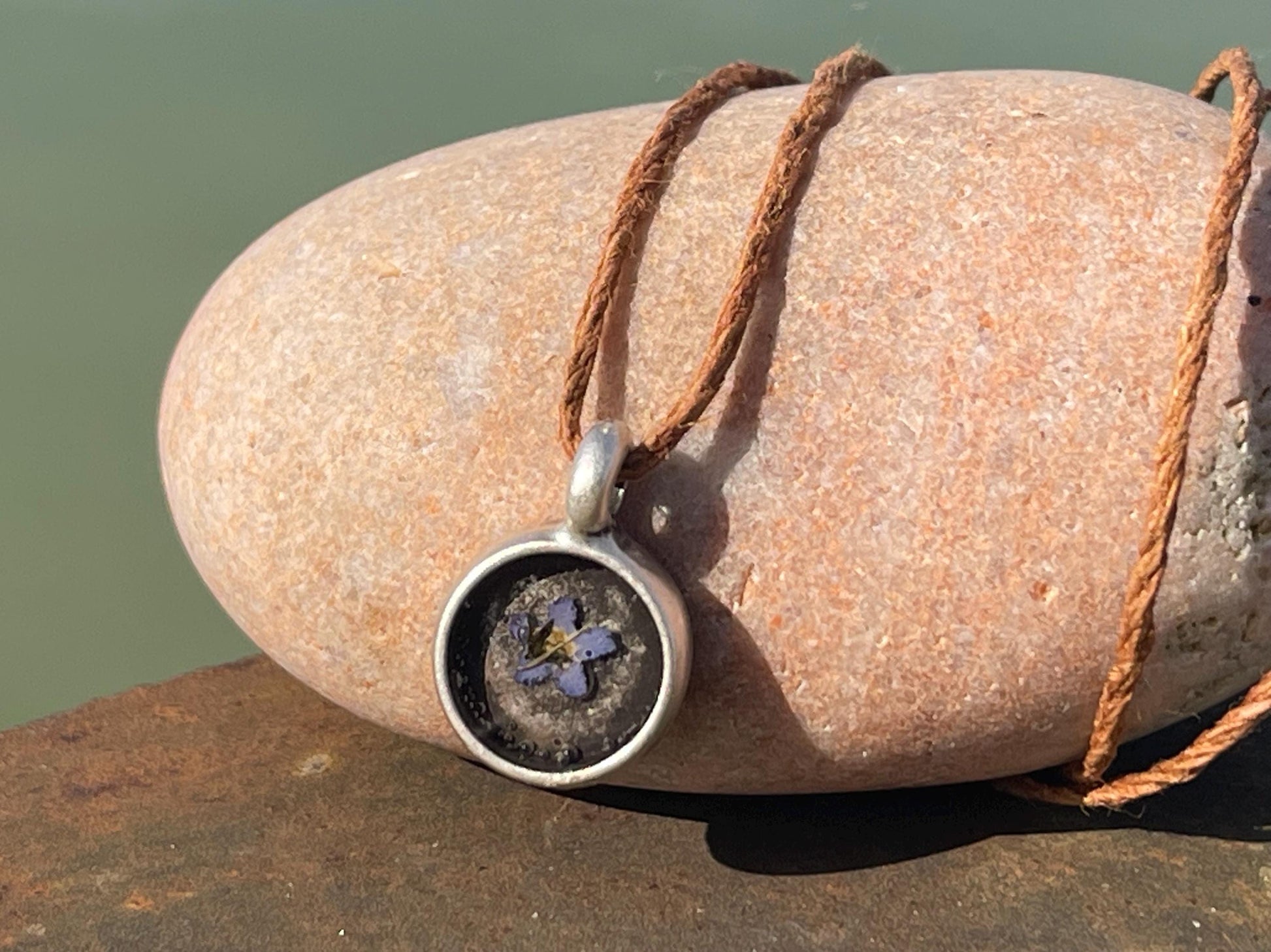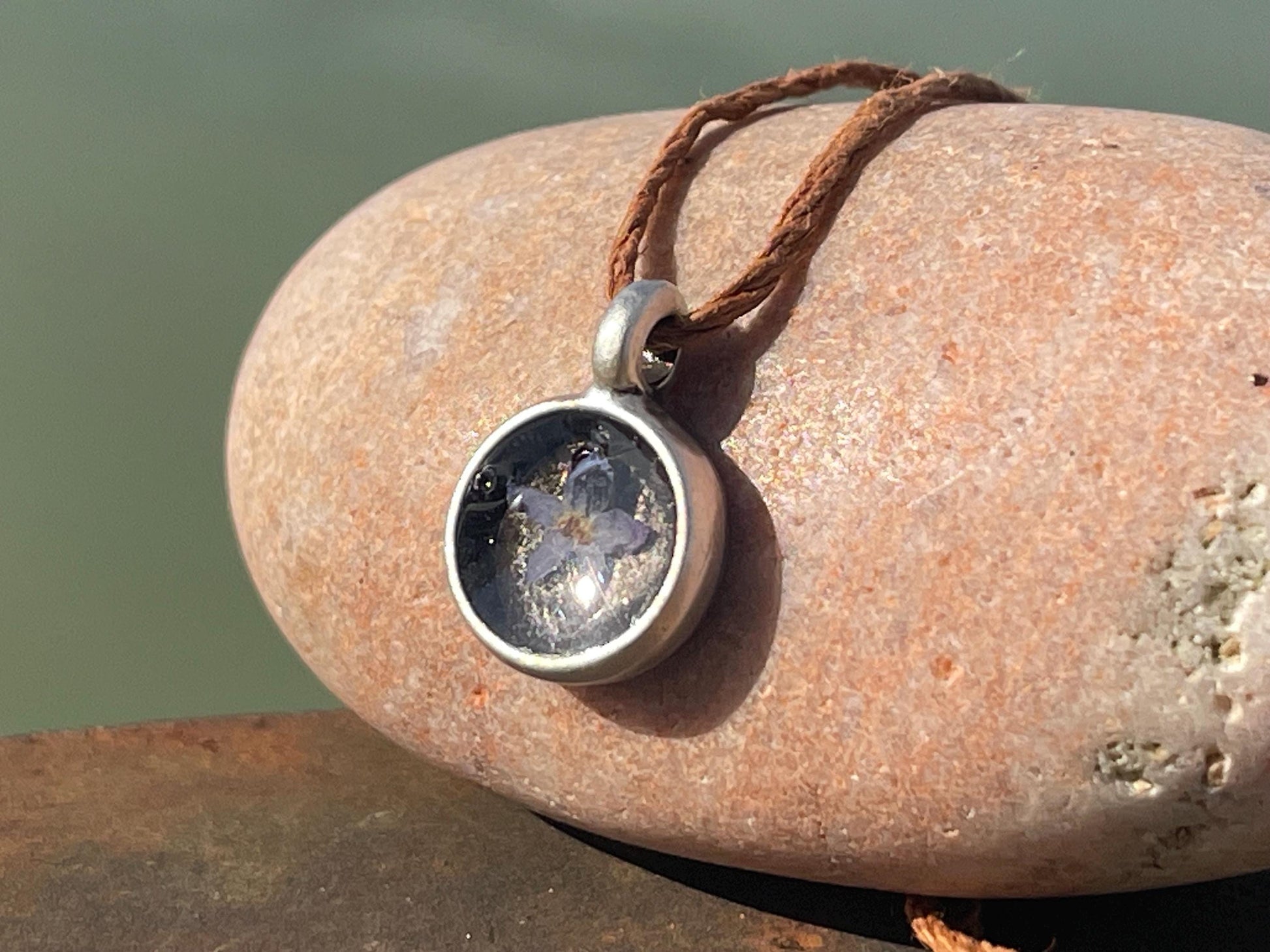 The flower is framed on brass coated with silver and has been hung on eco friendly hemp. I have left the hemp loose so you can tie at your preferred length.
