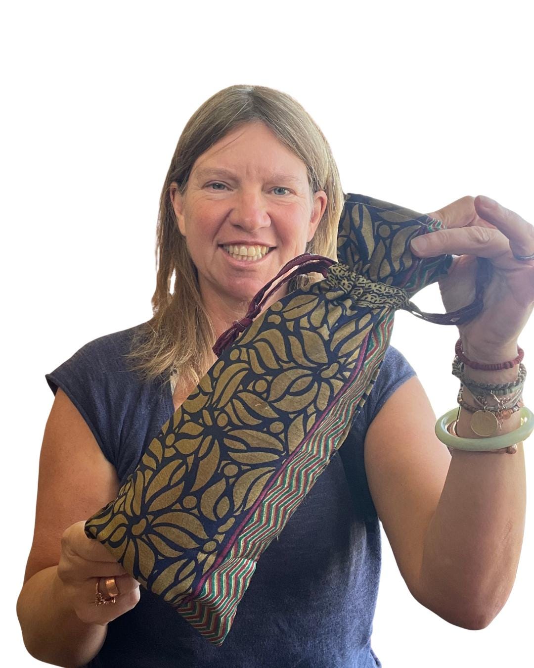 Recycled sari bottle bags with a pull string closure to seal around the bottle neck. With their double layered fabric, these bags offer stylish durability for reuse.