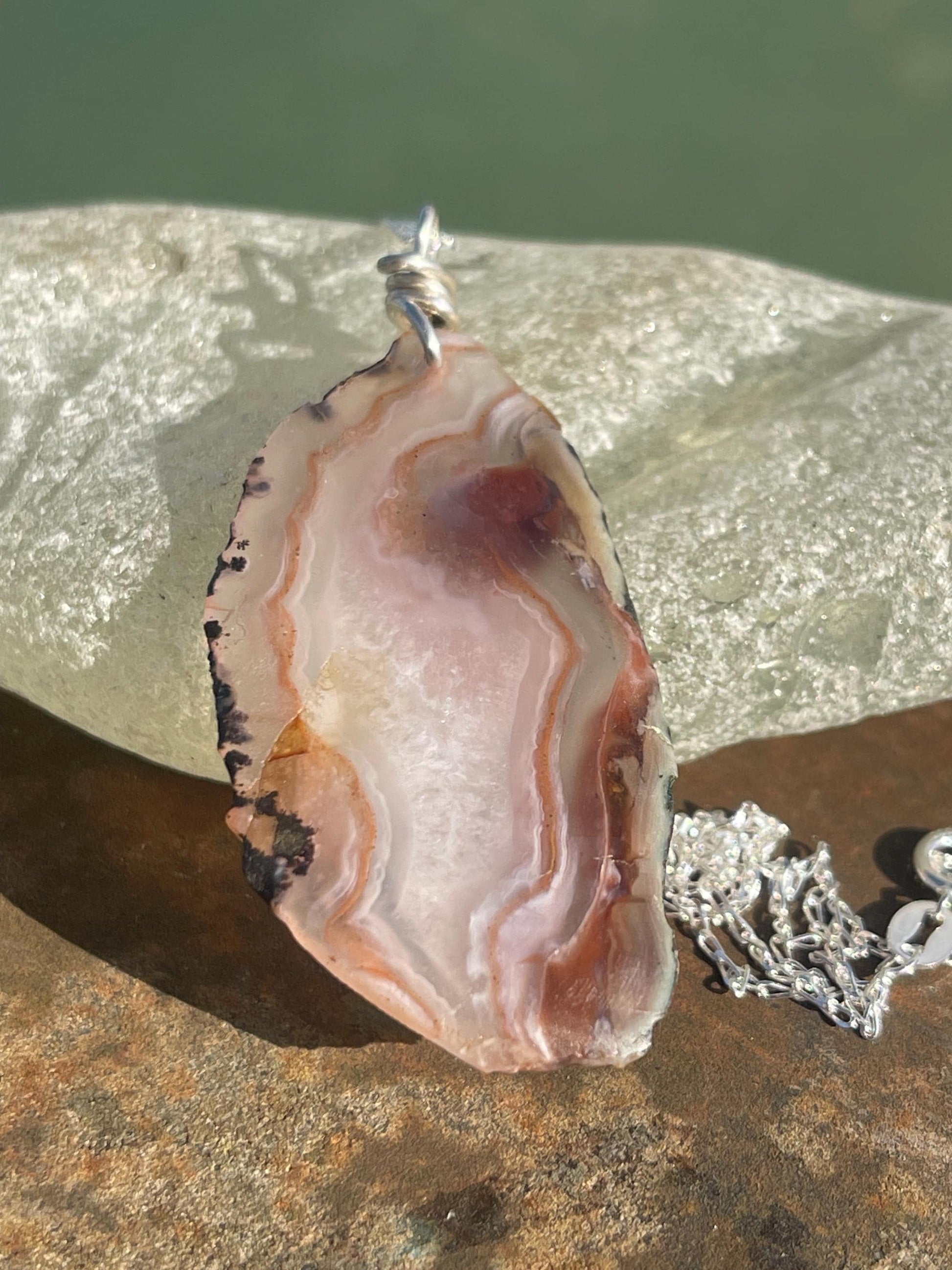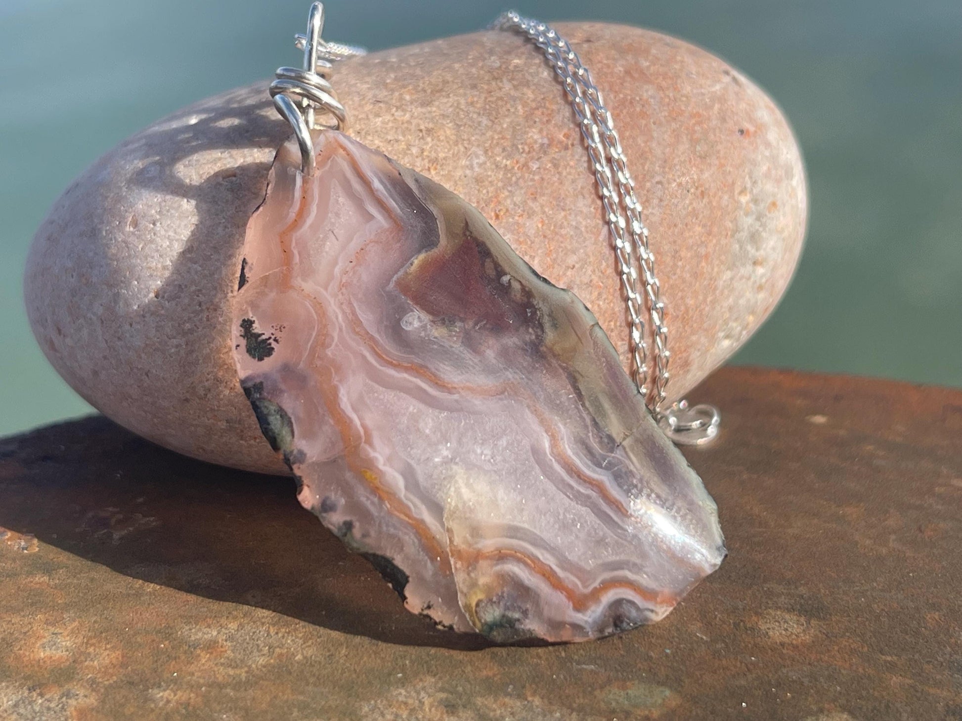 Beautiful ethically sourced agate held on recycled sterling silver. It is hung on a recycled sterling silver 18 inch chain.