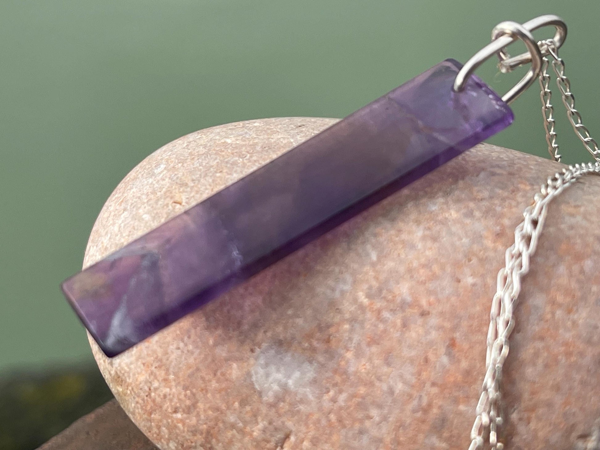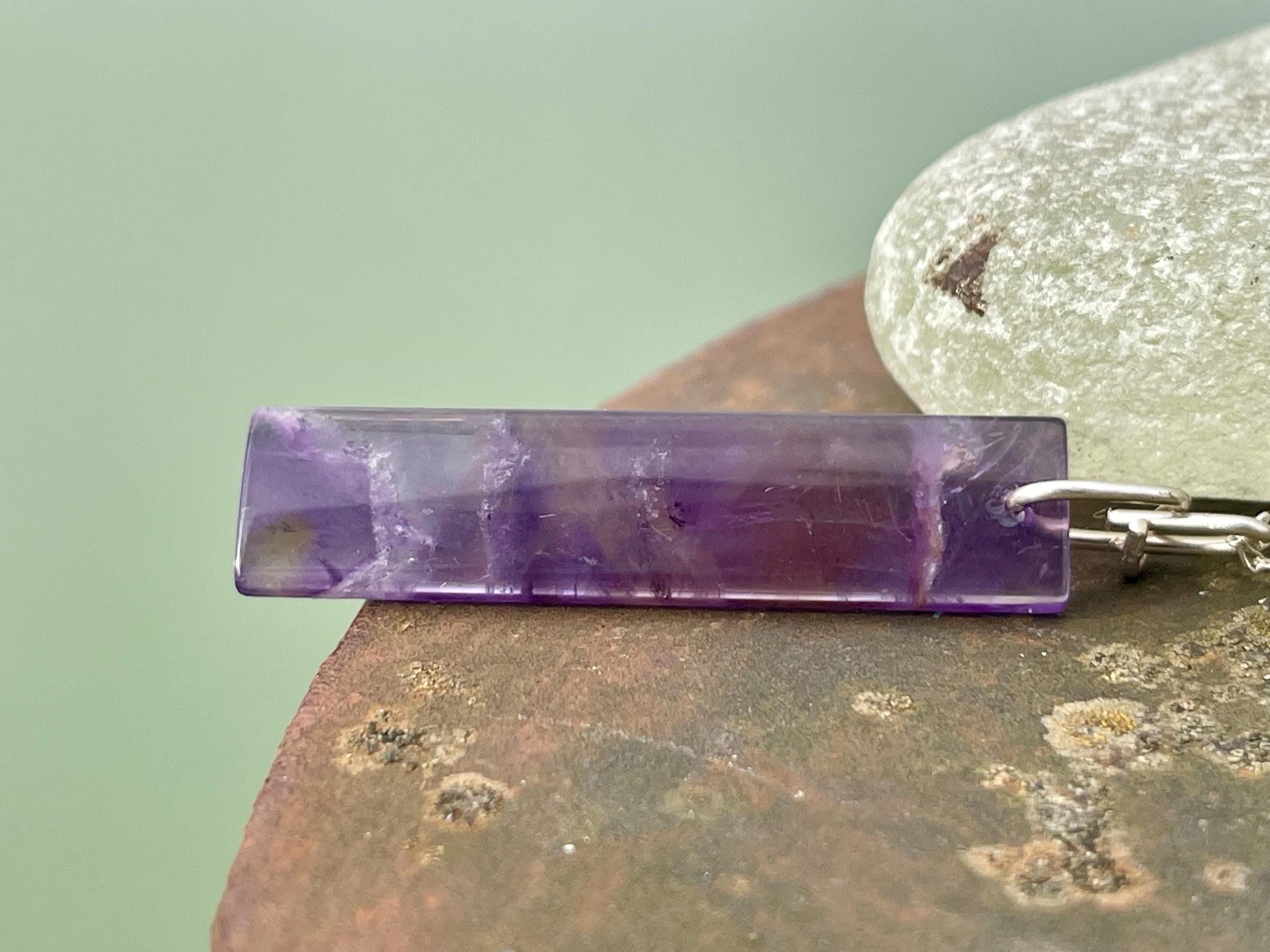 This is a stunning piece of ethically sourced amethyst held on recycled sterling silver. The pendant has been hung on an 18 inch recycled sterling silver chain. You will receive one of the two pieces pictured, both very similar.