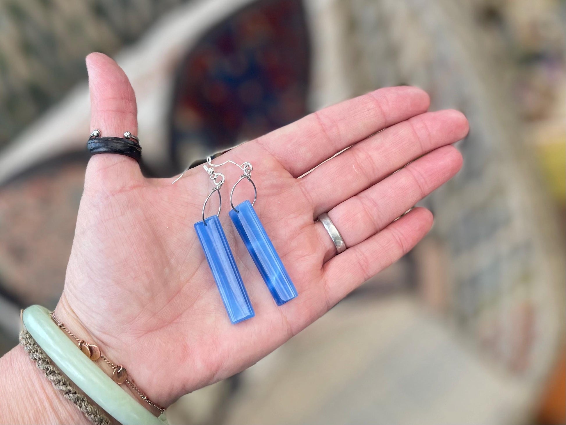 Blue onyx gemstone earrings. Long drop dangly earrings. Blue gemstone earrings. Ethical jewellery, blue jewellery. Handmade onyx jewellery.