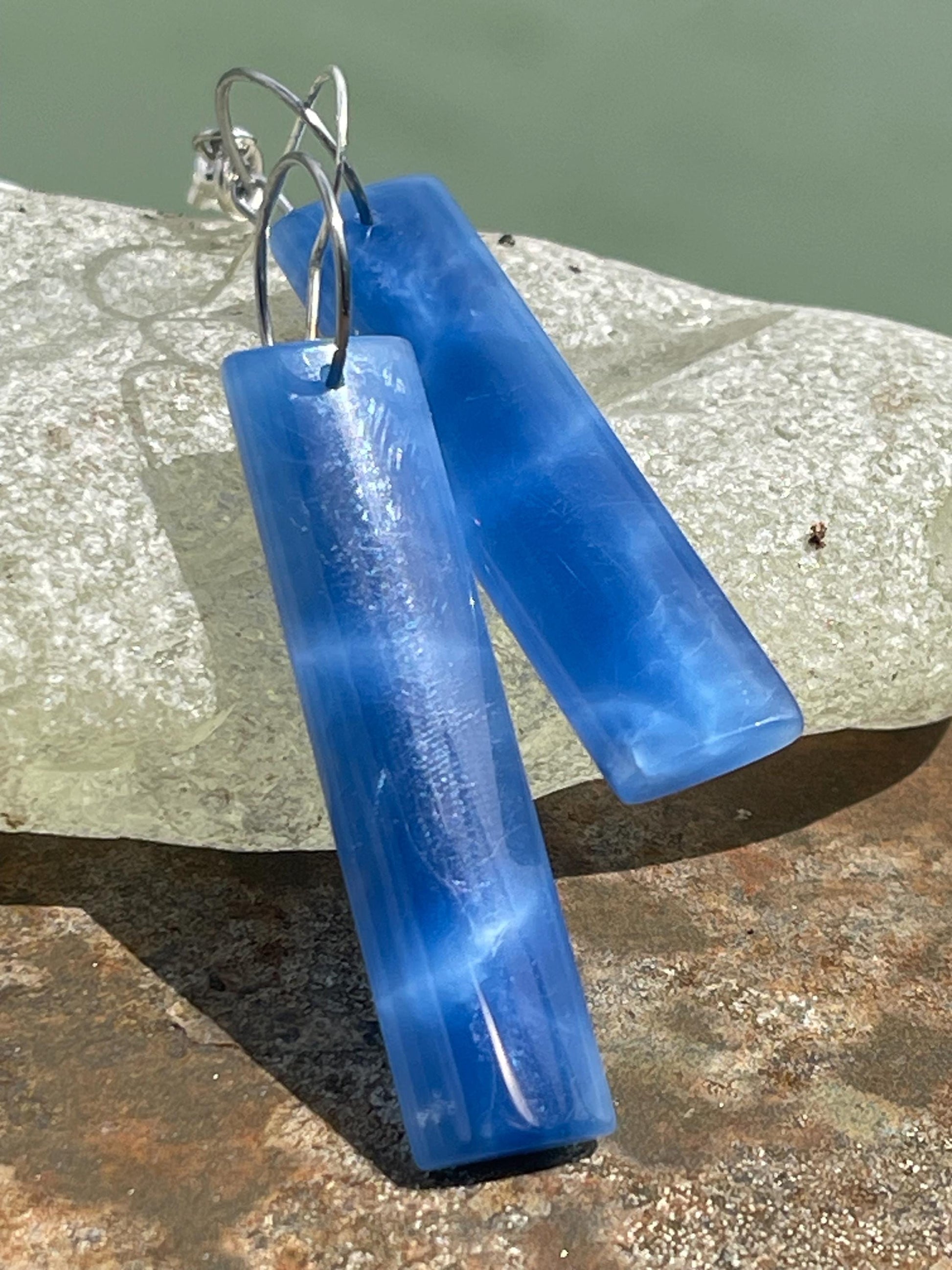 Absolutely stunning ethically sourced blue onyx gemstones, shaped, drilled and hung on high quality sterling silver ear hooks.