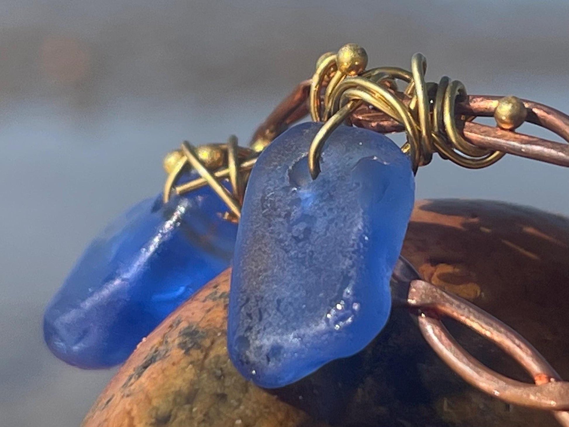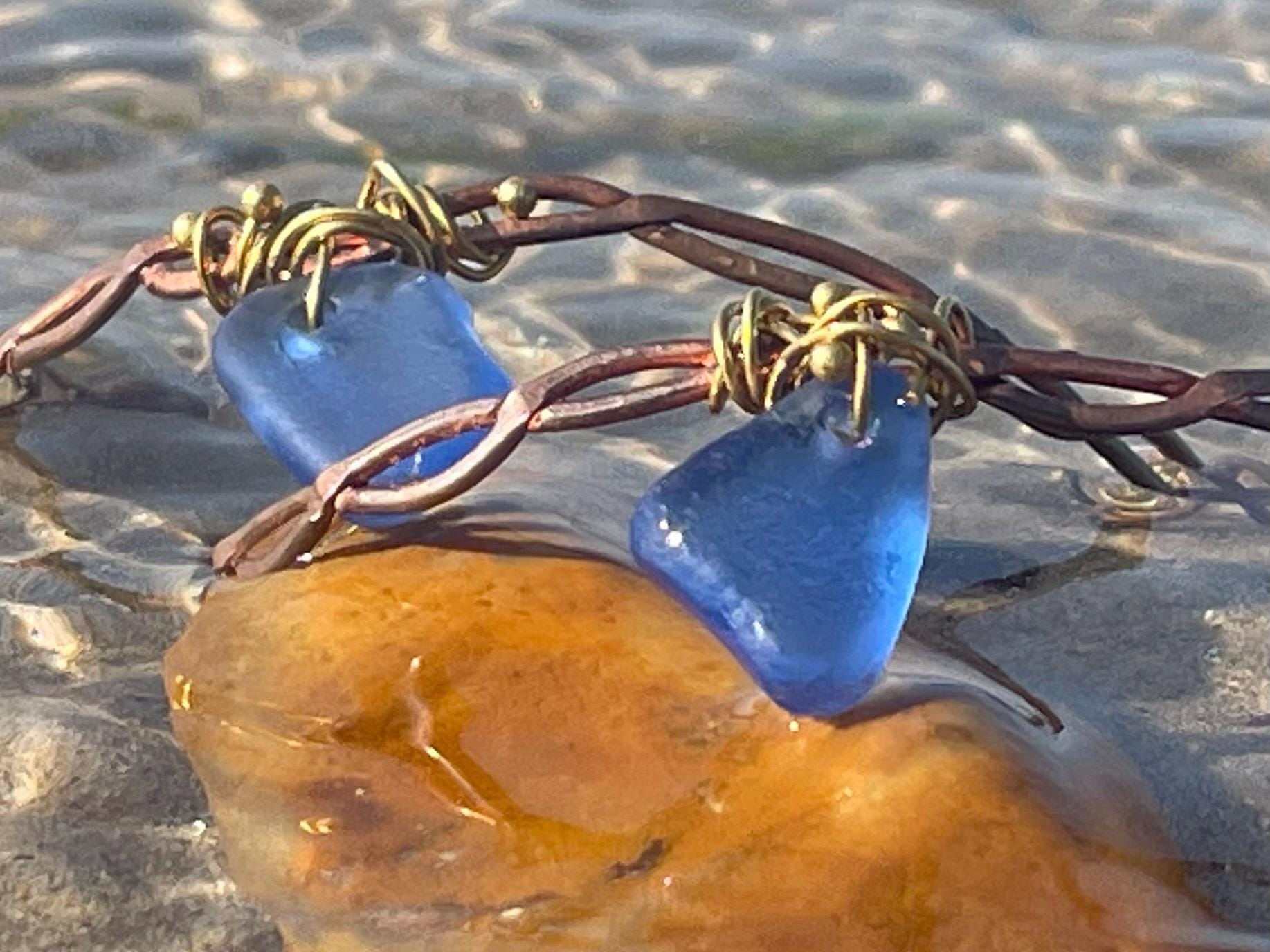 Blue sea glass and recycled copper bracelet. Eco friendly rustic beach jewellery. Unique boho jewellery. Blue sea glass bracelet. Ethical