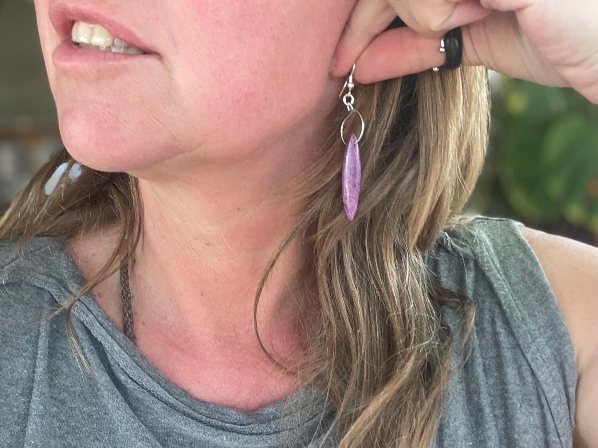 Ethically sourced charoite earrings - handmade and unique. These beautiful gemstones are held on sterling silver.