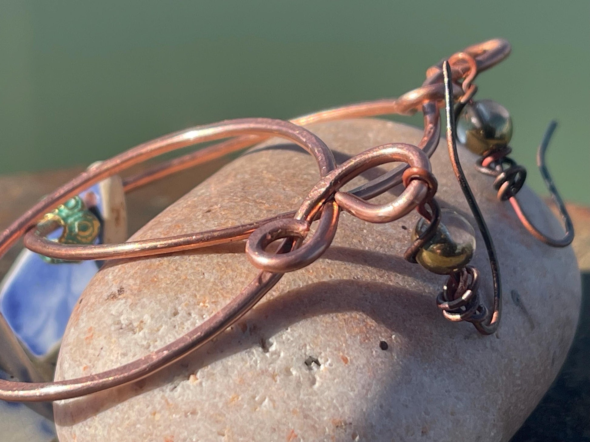 Eco friendly blue ceramic and recycled copper earrings. Unique earrings, ethical jewellery, unusual boho jewellery, eco friendly jewellery.