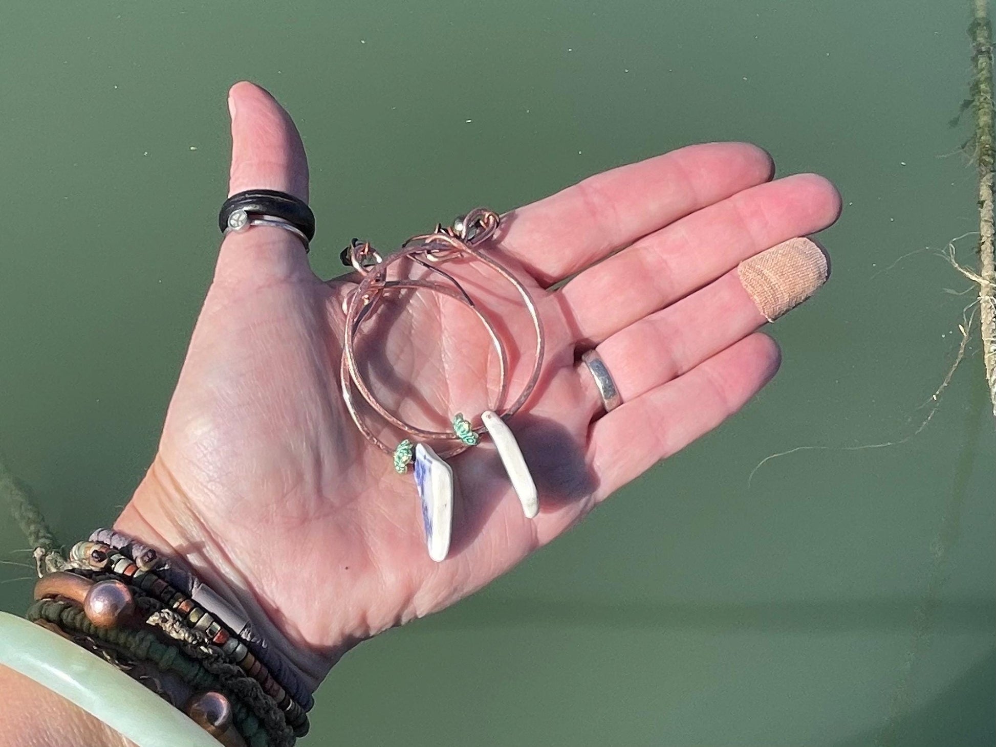 Unique sea ceramic earrings hung on copper stripped from waste electrical cables. The ear hooks are made from hammered brass.
