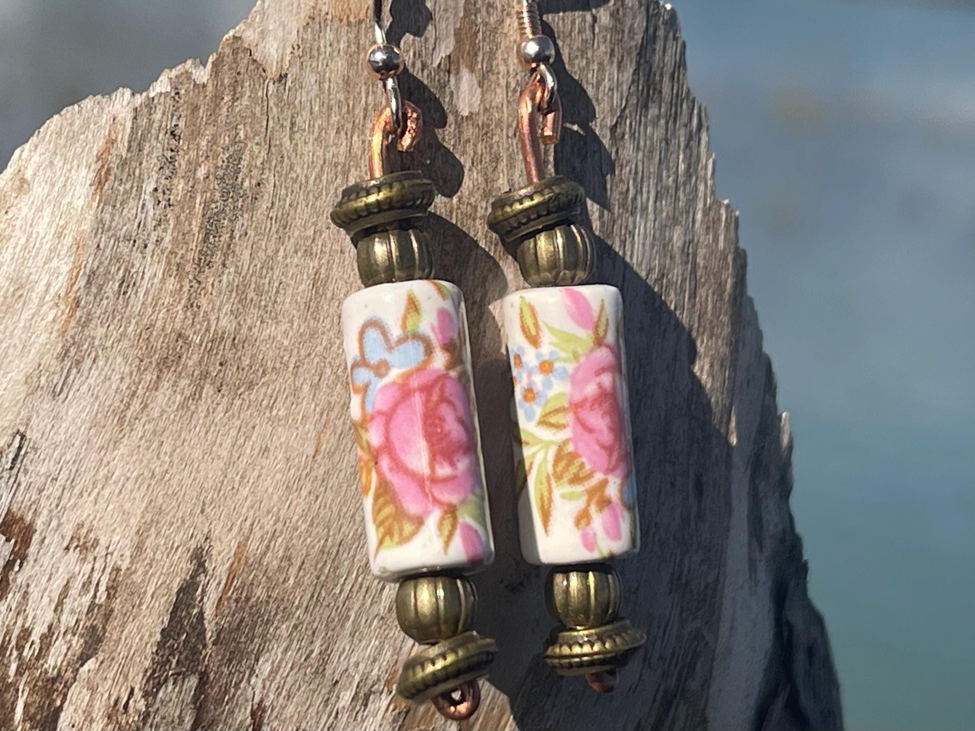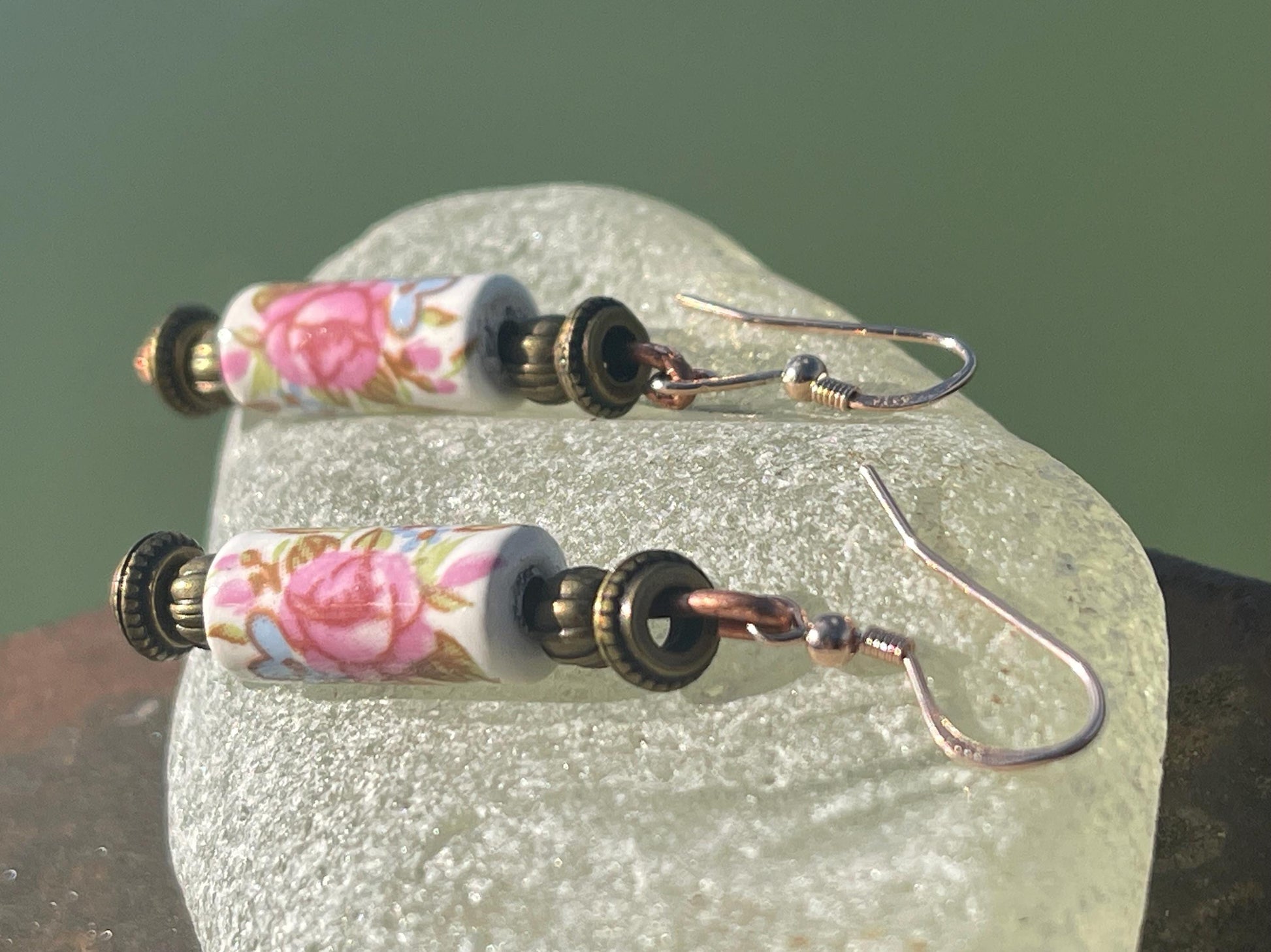Eco friendly earrings made from vintage beads and recycled copper. Hypoallergenic rose gold ear hooks. Ethical handmade jewellery.