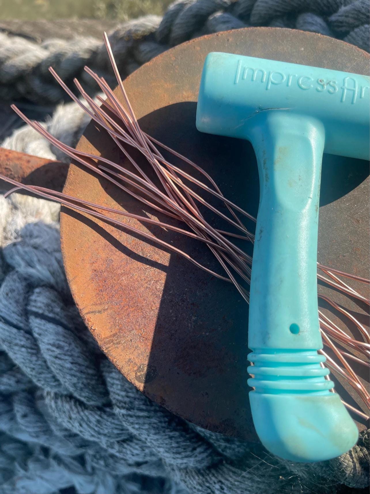 Unique sea glass earrings hung on copper stripped from waste electrical cables. I have also added some up-cycled beading. The ear hooks are made from hammered copper.
