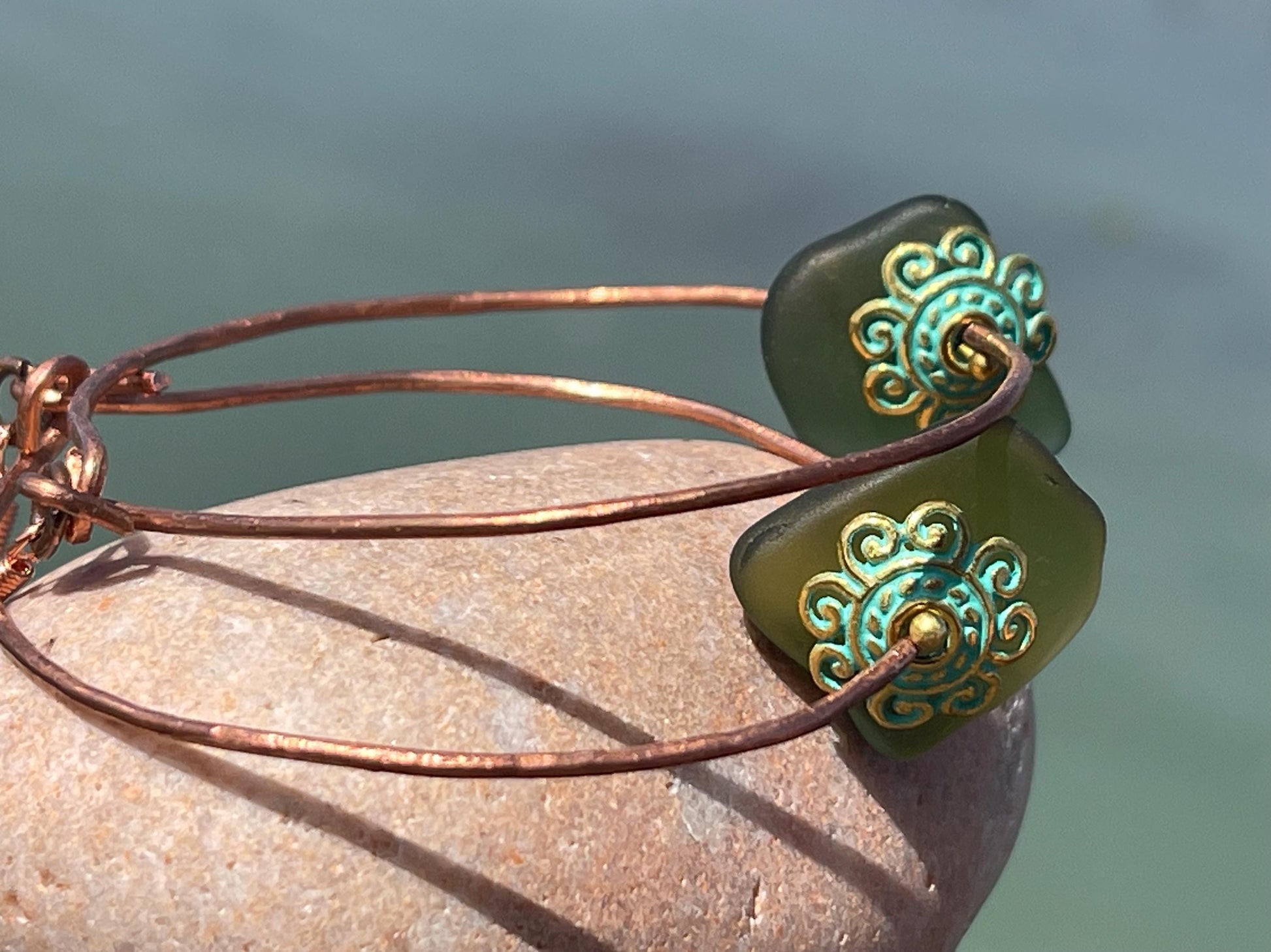 Eco friendly large sea glass & recycled copper earrings. Unique earrings, ethical jewellery, unusual boho jewellery, eco friendly jewellery.