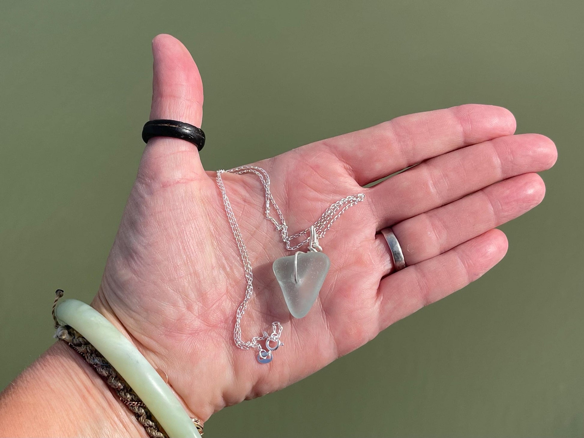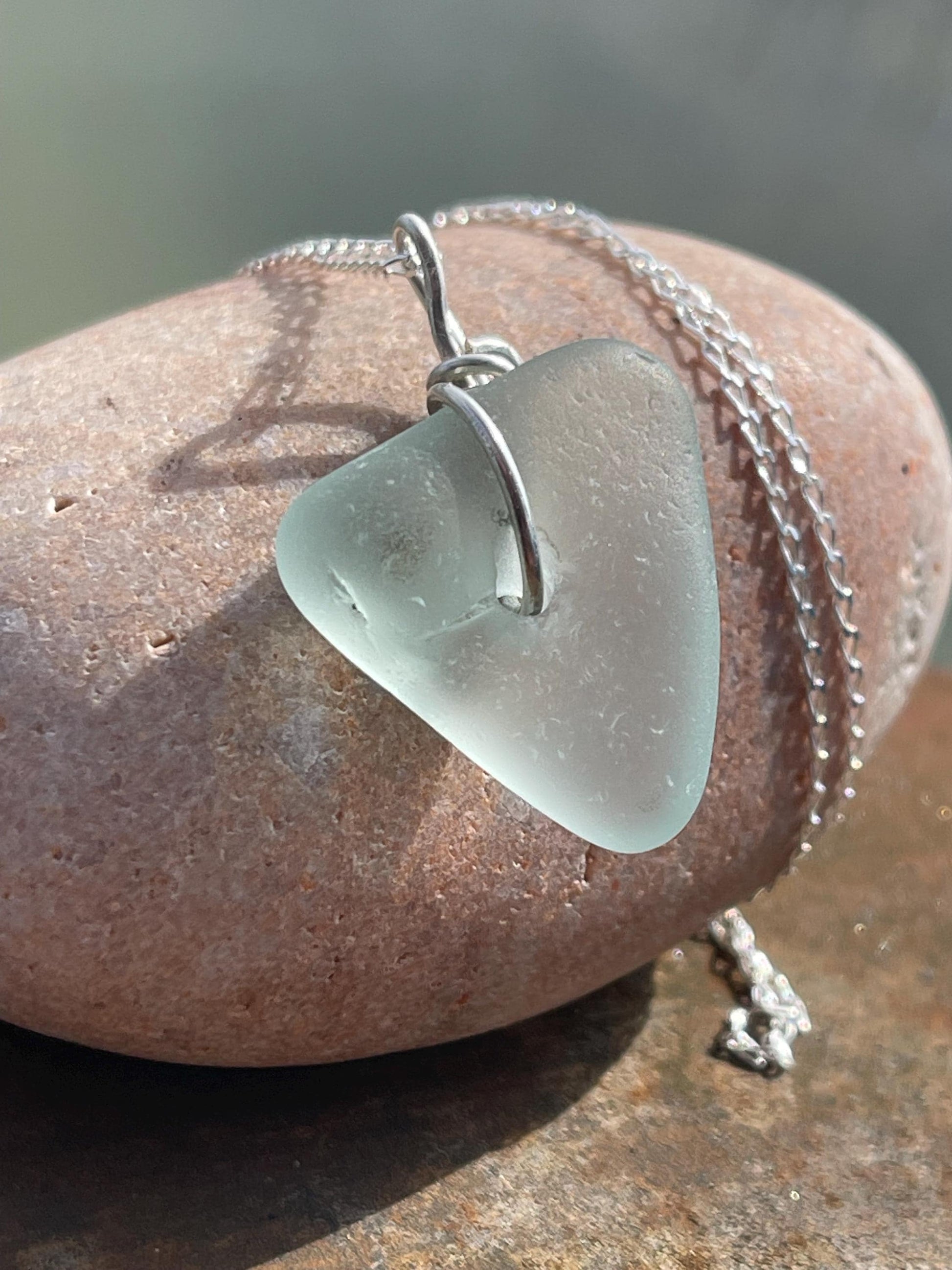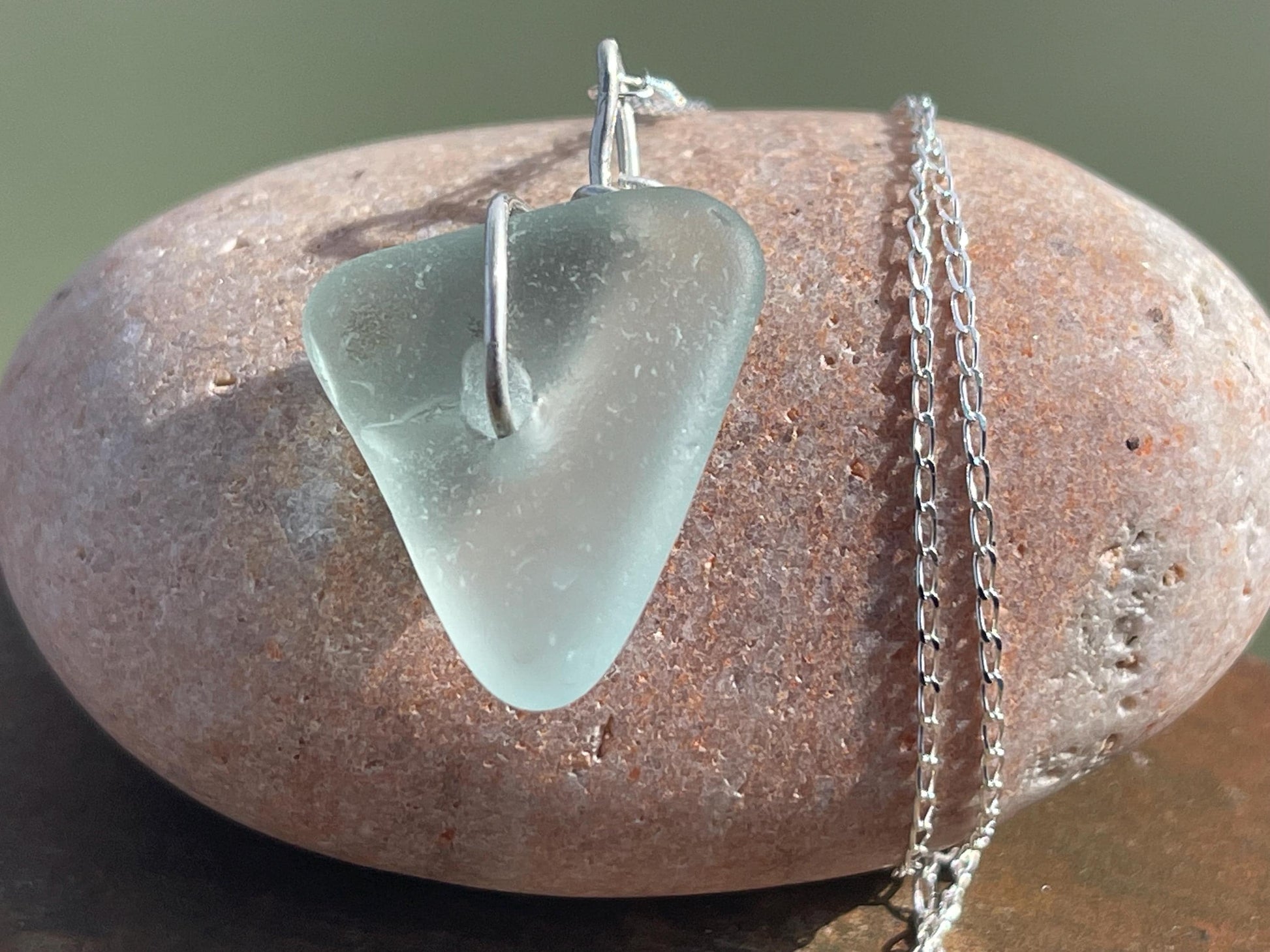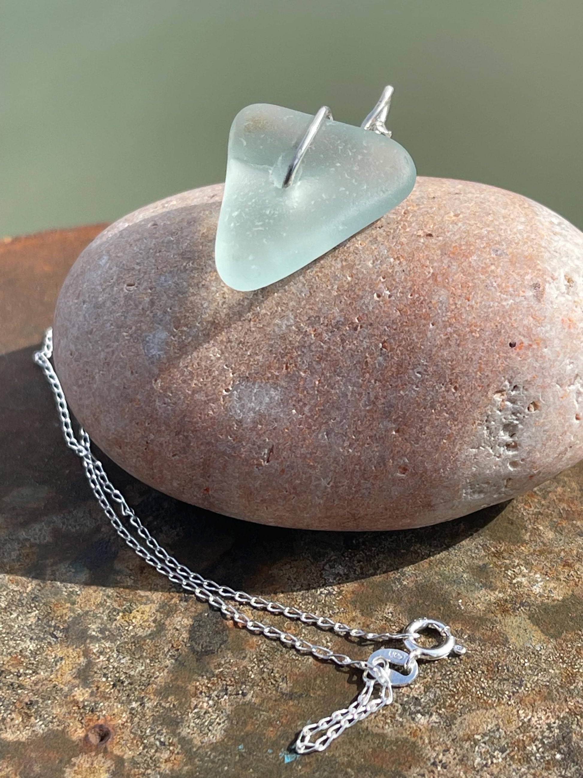 Eco friendly necklace. Aqua sea glass necklace on a recycled sterling silver chain. Handmade eco friendly jewellery. ethical jewellery