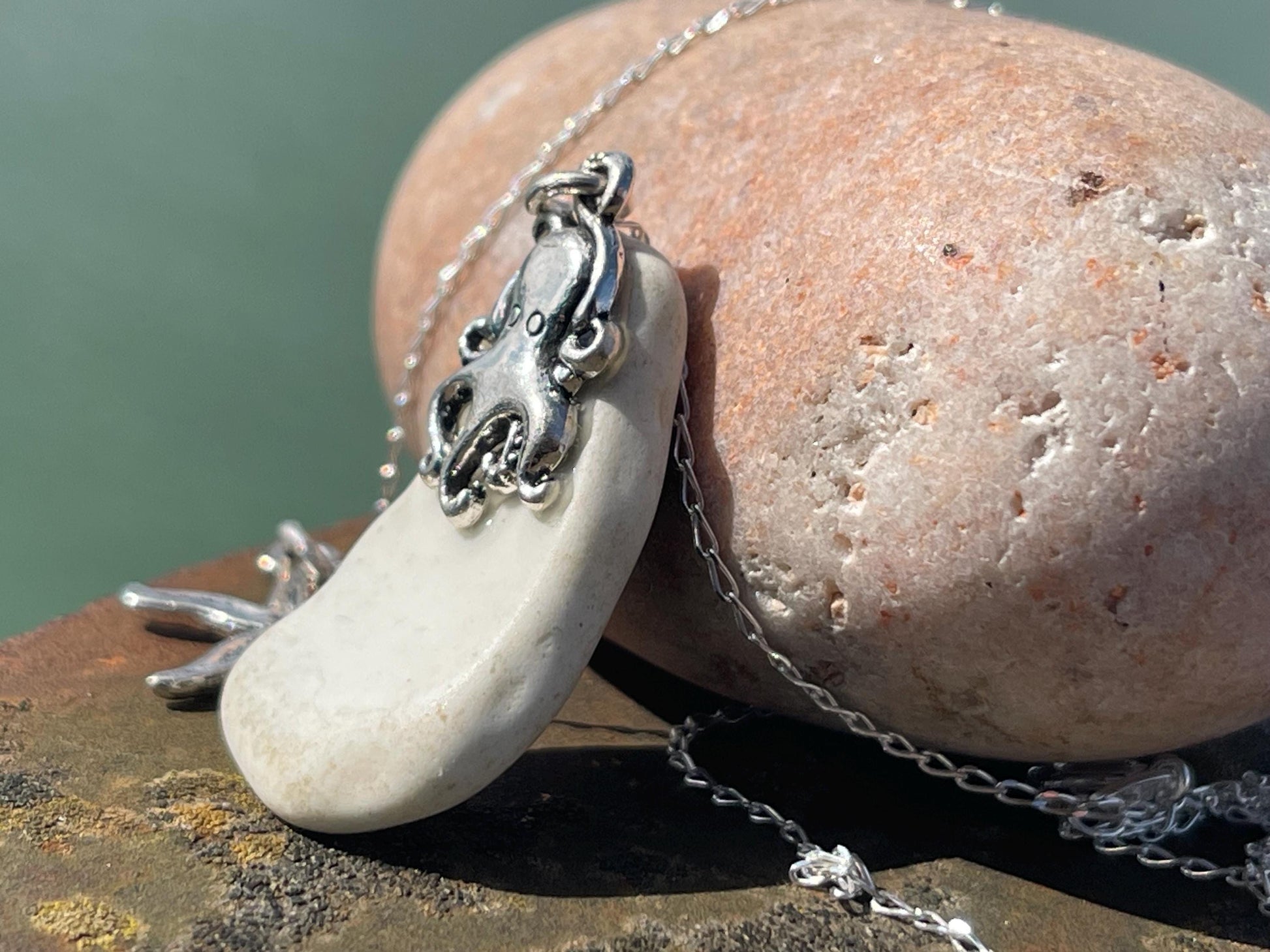 I have added a silver starfish (which sits to the side edge of the glass) and have hung the piece on a recycled sterling silver chain (18"/45cm in length). It is backed by a little octopus :)