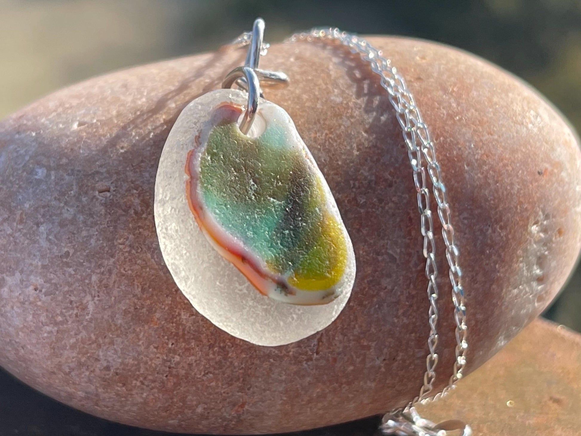 Eco friendly sea glass necklace on a sterling silver chain. Eco friendly jewellery. Unusual sea glass jewellery. Handmade ethical jewellery