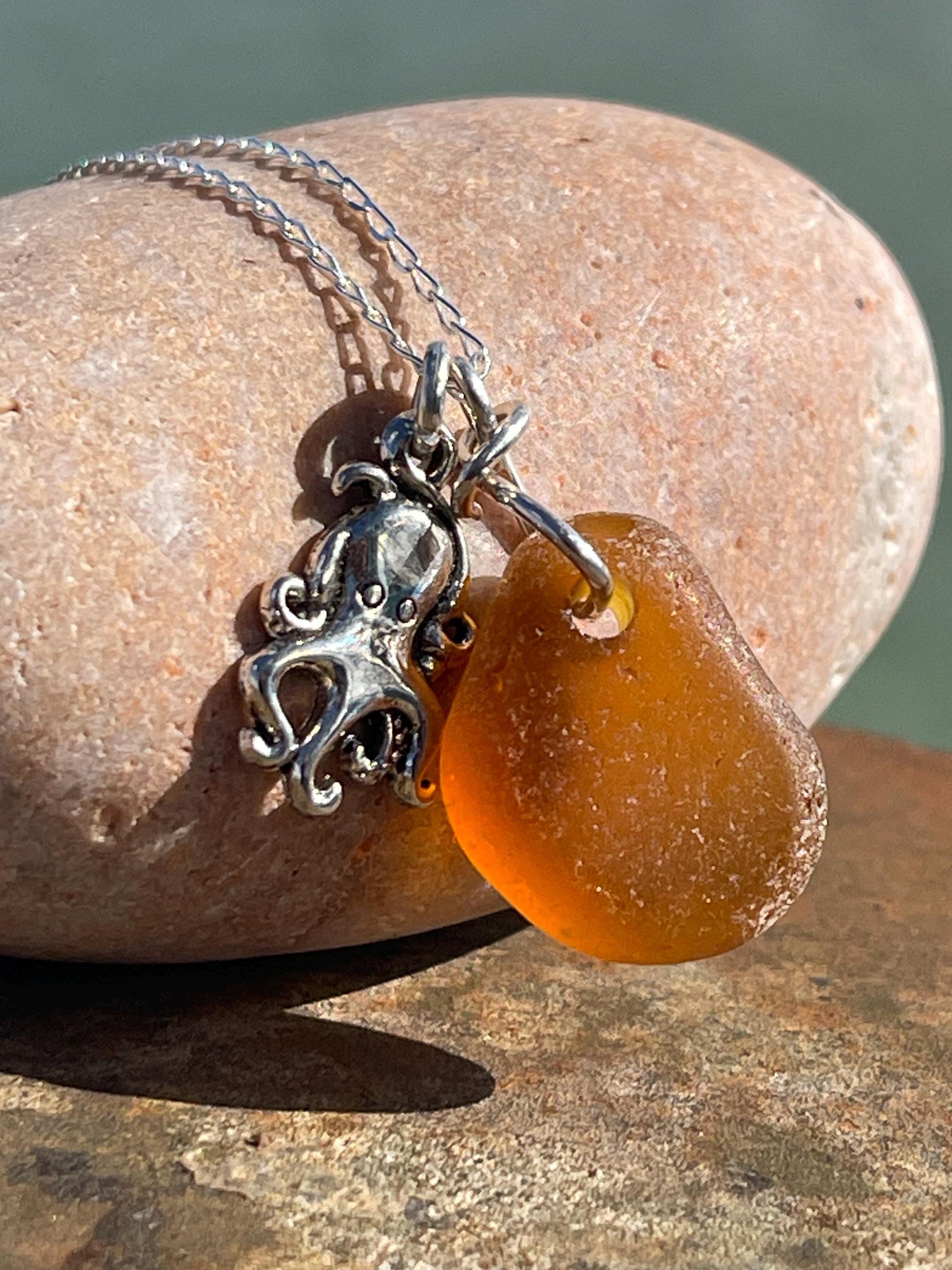 Eco friendly sea glass necklace on a sterling silver chain showcasing a little octopus. Octopus pendant, octopus necklace, ethical jewellery