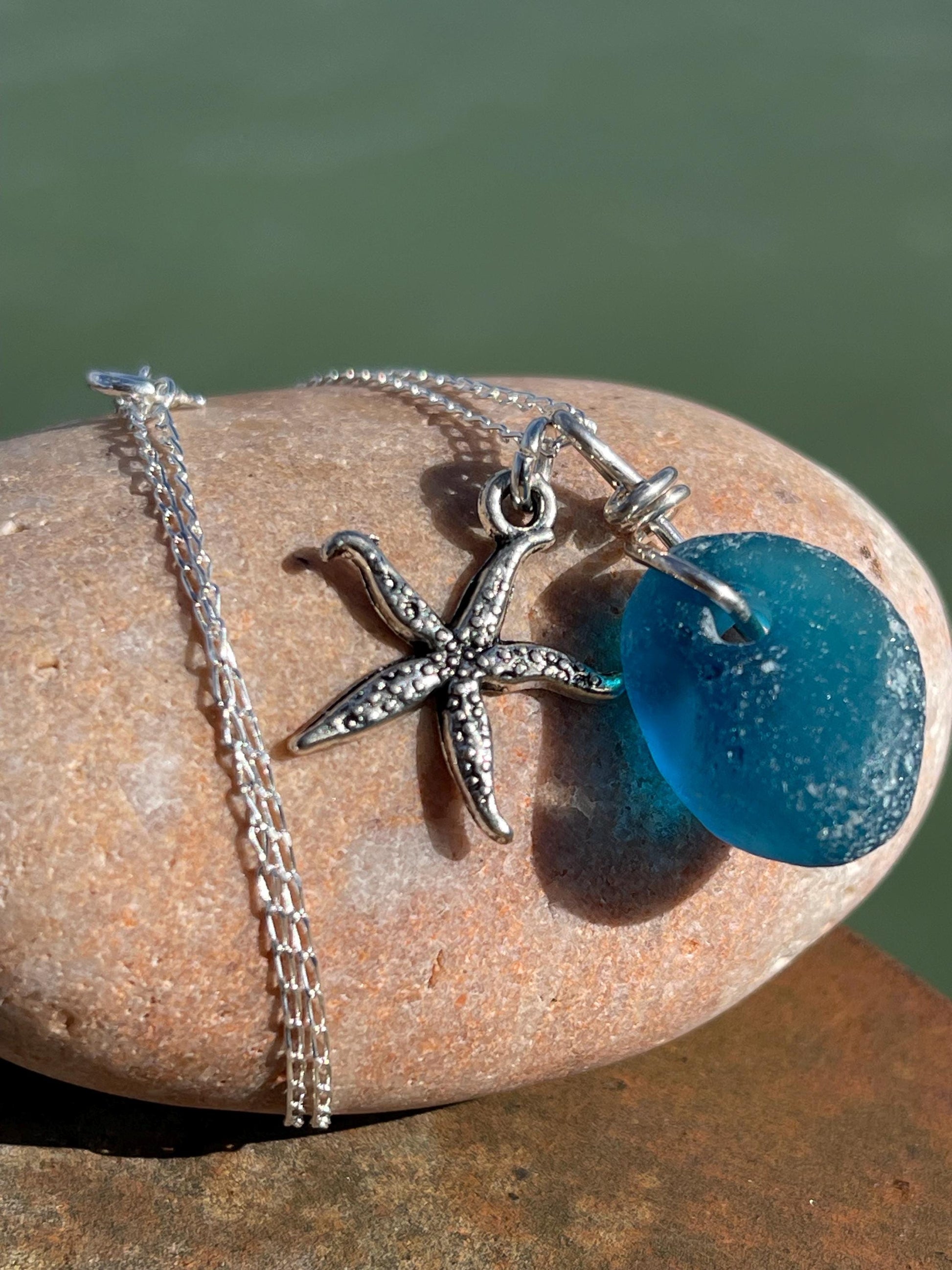 Eco friendly sea glass necklace on a sterling silver chain showcasing a little starfish. Starfish pendant, ethical jewellery. Sea swimming