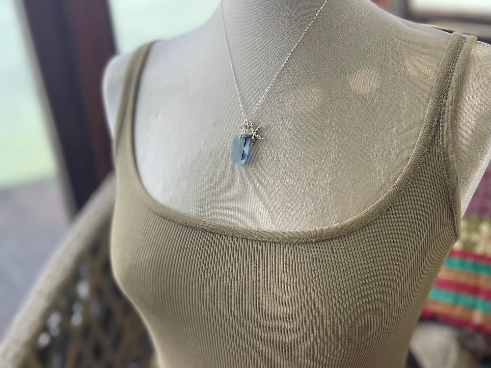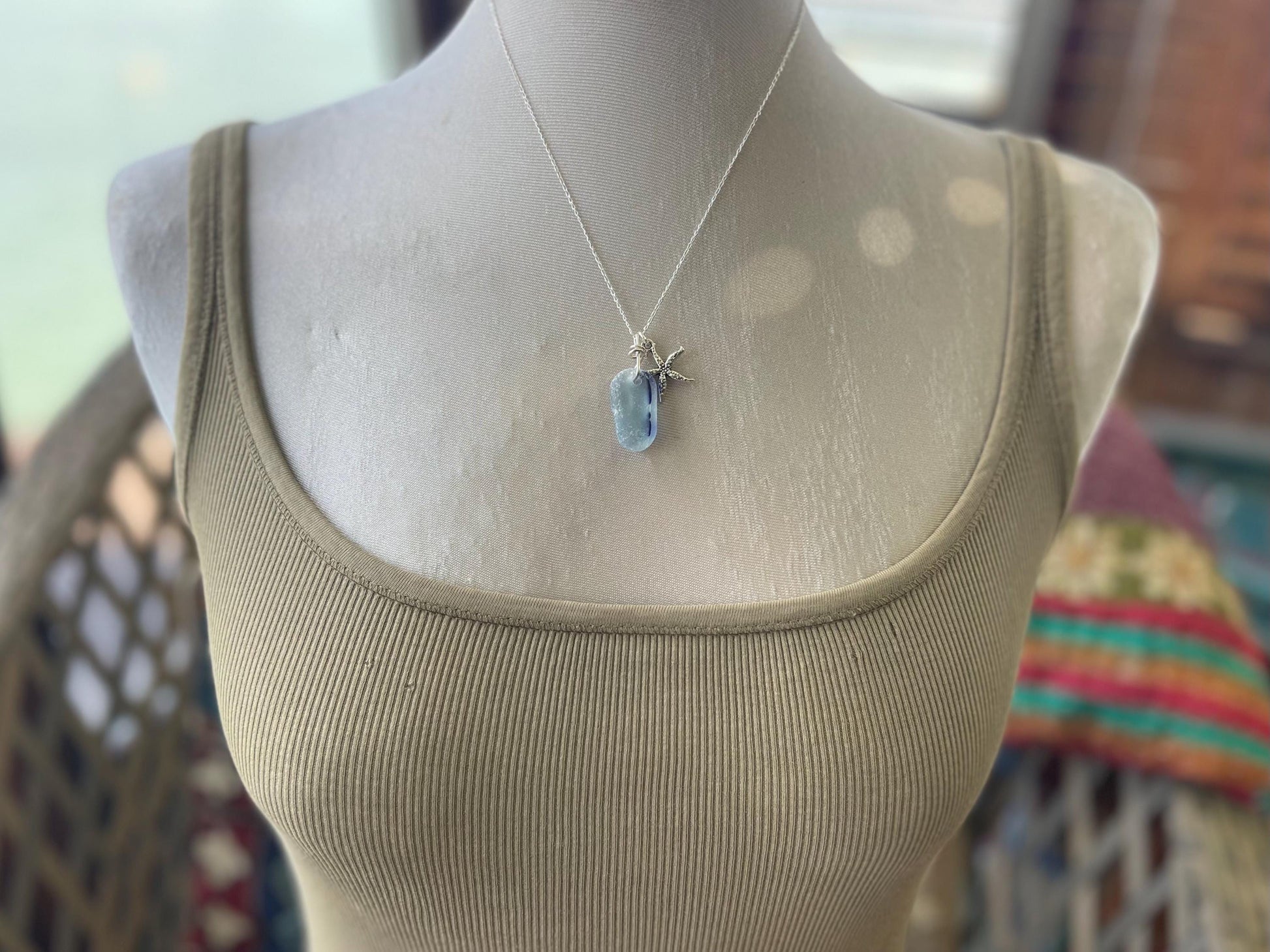 Eco friendly sea glass necklace on a sterling silver chain showcasing a starfish. Starfish pendant, starfish necklace, ethical jewellery
