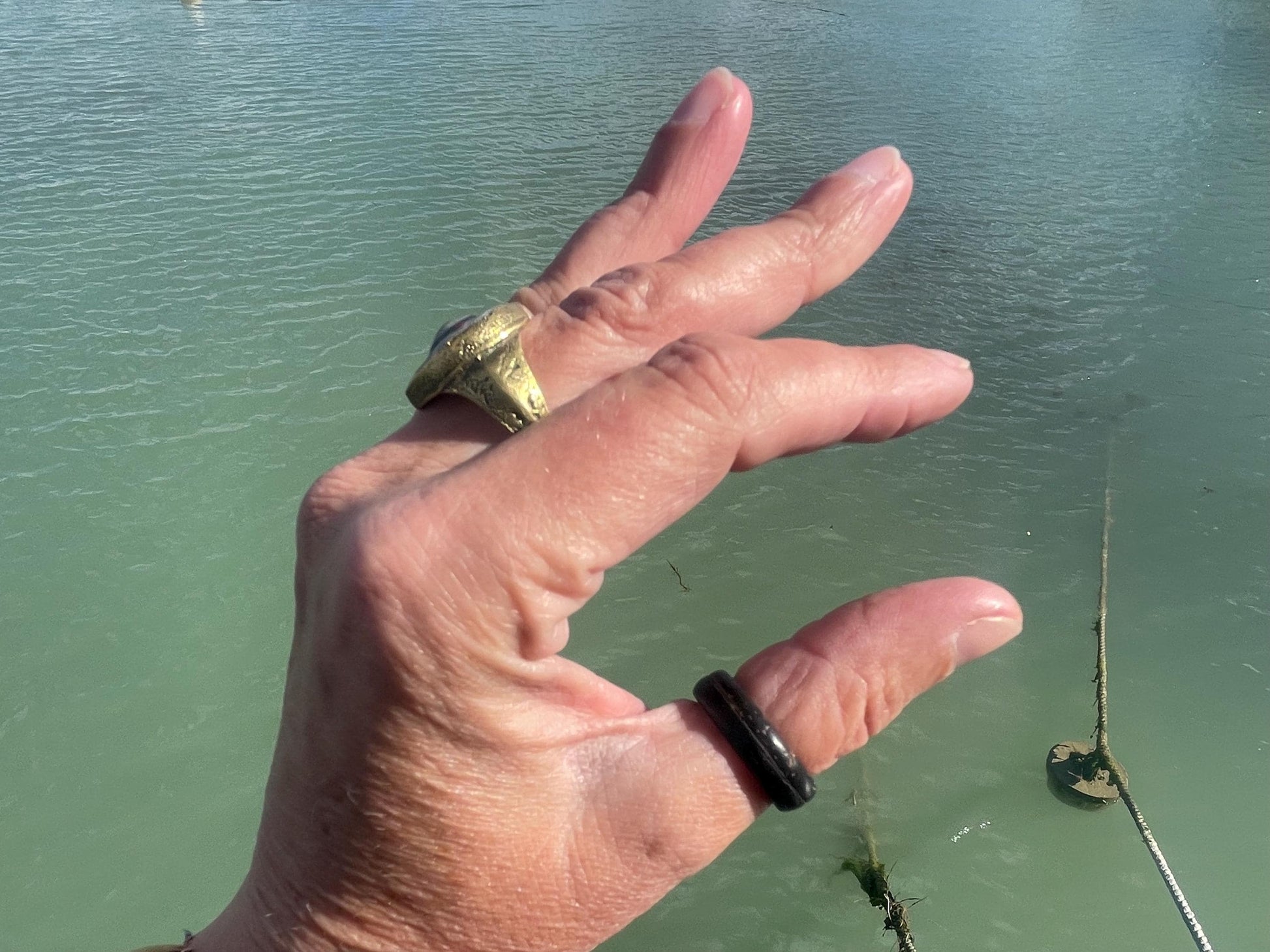 To work out your ring size Take a length of floss or string and wrap it around the base of your finger. Mark where the floss or string first overlaps with a pen. Stretch the length of string out along a ruler or measuring tape, and take down the length in millimetres. You can then scroll left (within my product pictures) to see my ring size chart and find out what size you are. Easy!
