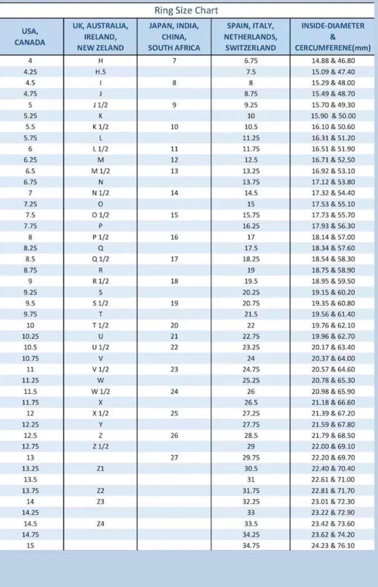 To work out your ring size Take a length of floss or string and wrap it around the base of your finger. Mark where the floss or string first overlaps with a pen. Stretch the length of string out along a ruler or measuring tape, and take down the length in millimetres. You can then scroll left (within my product pictures) to see my ring size chart and find out what size you are. Easy!