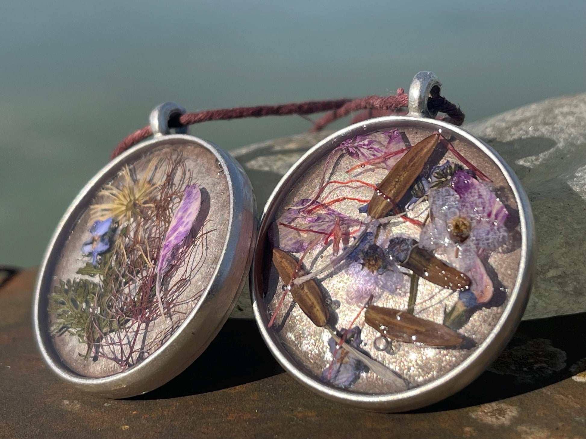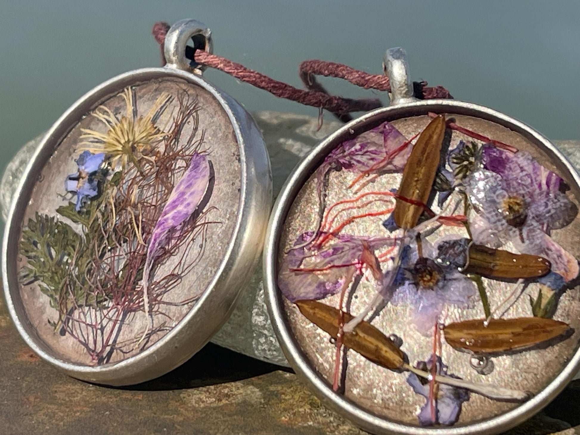 The flowers are framed on silver plated brass and hung on hemp - left loose so you can tie at your preferred length.