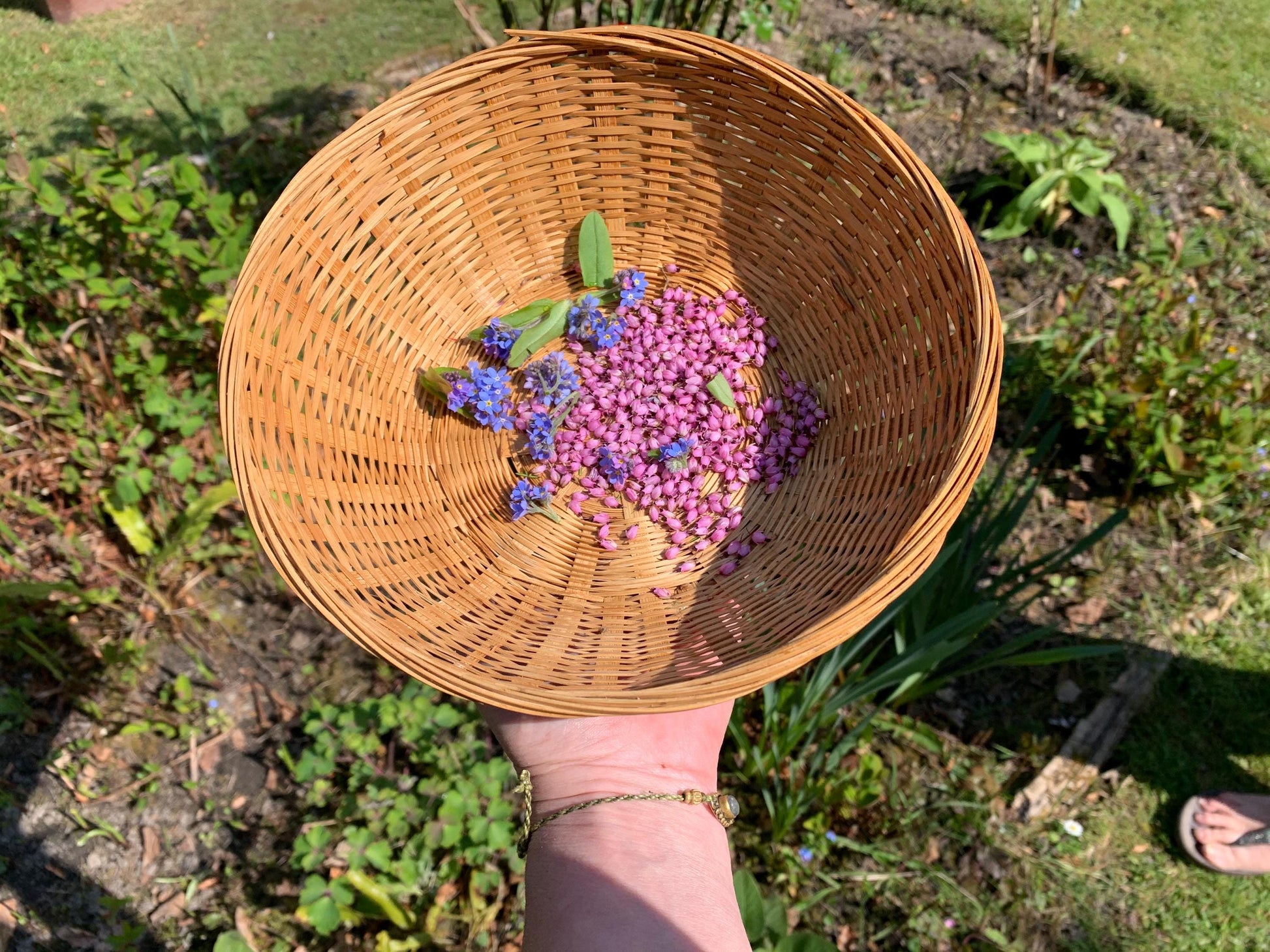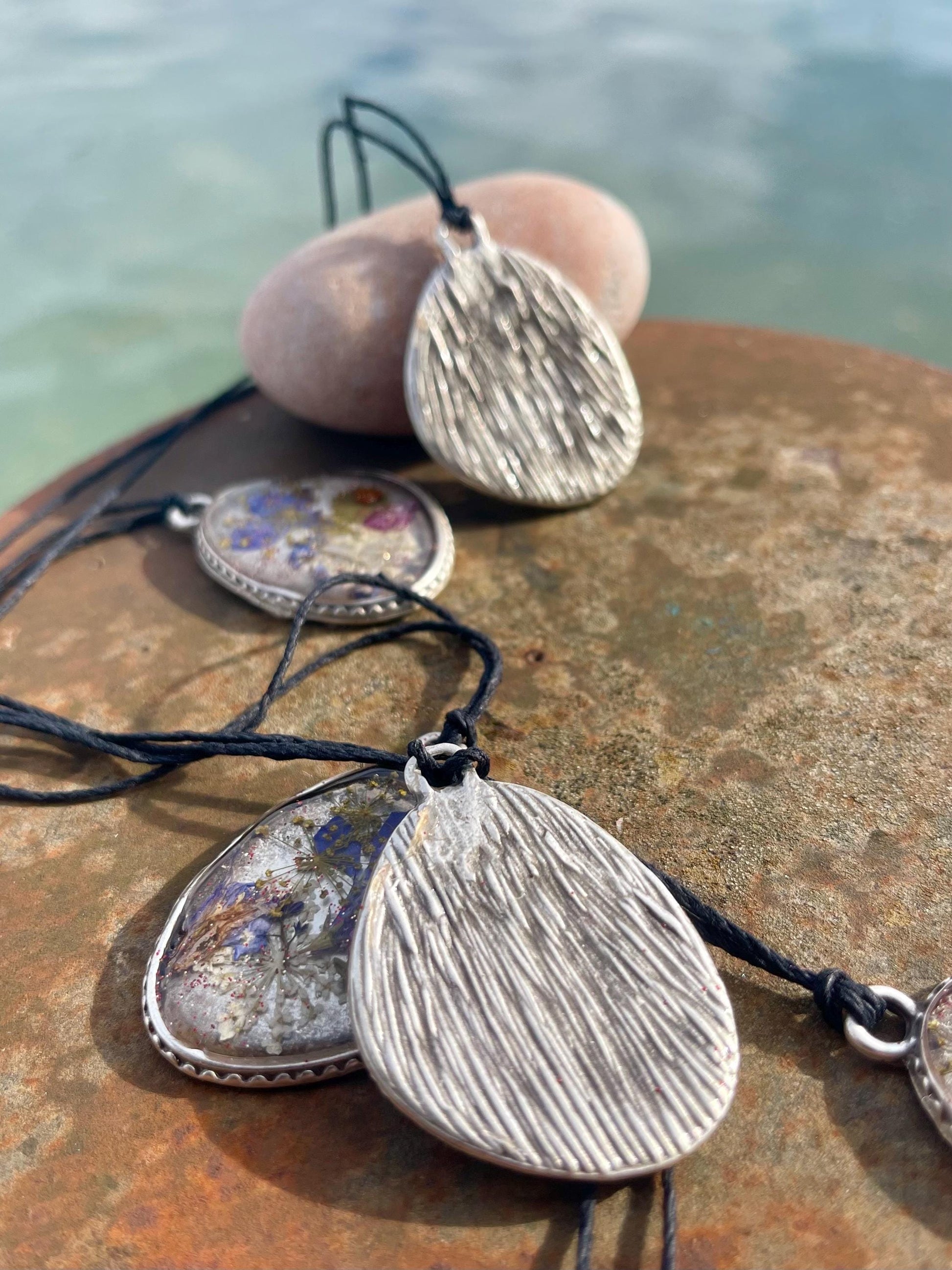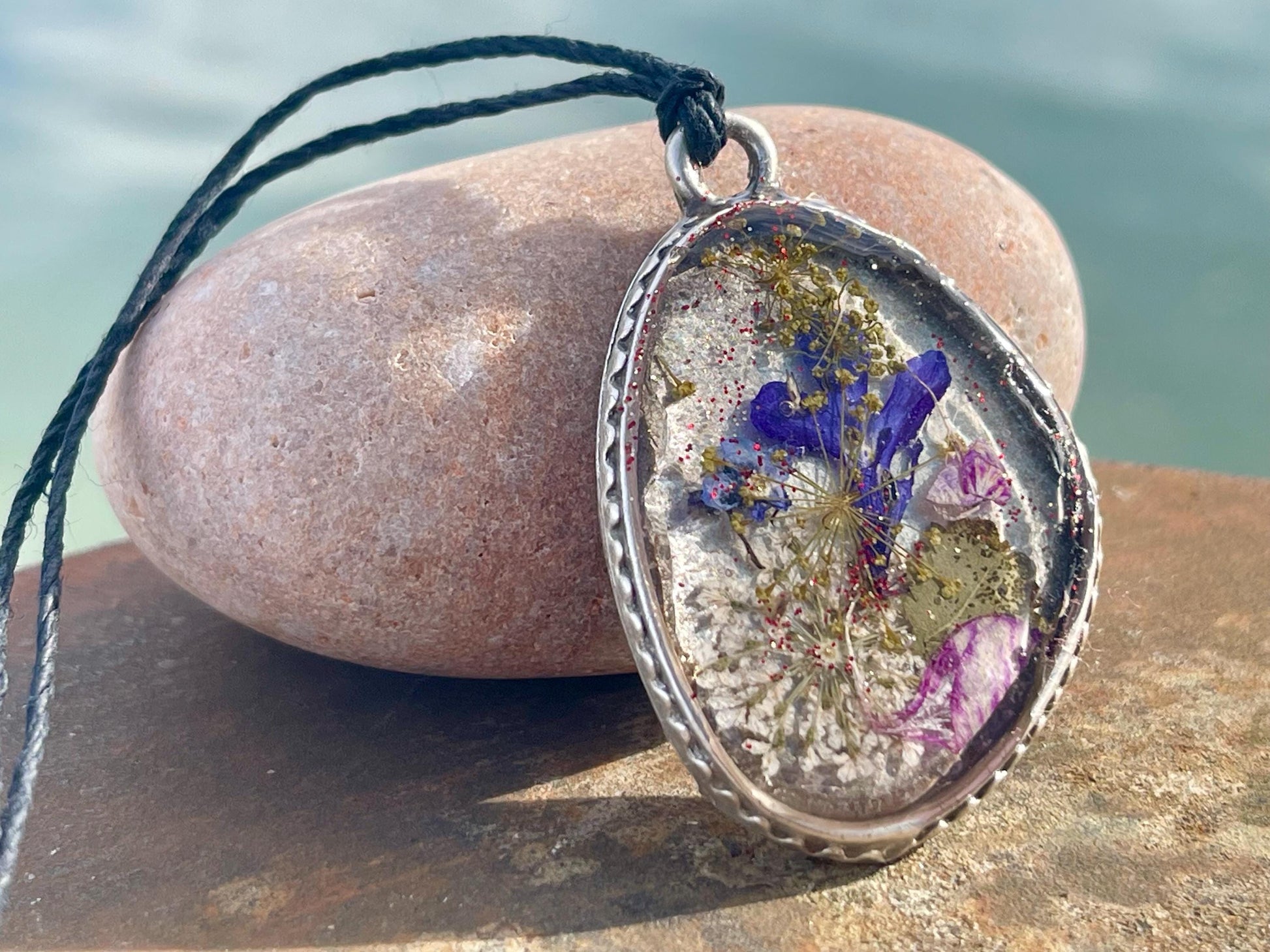 Romantic Violet flower necklace. Also showcasing forget-me-nots, carrot flowers and little specs of eco glitter (made from plants not plastic). All the flowers are hand pressed and grown in my garden :) You will receive one of the pieces pictured.