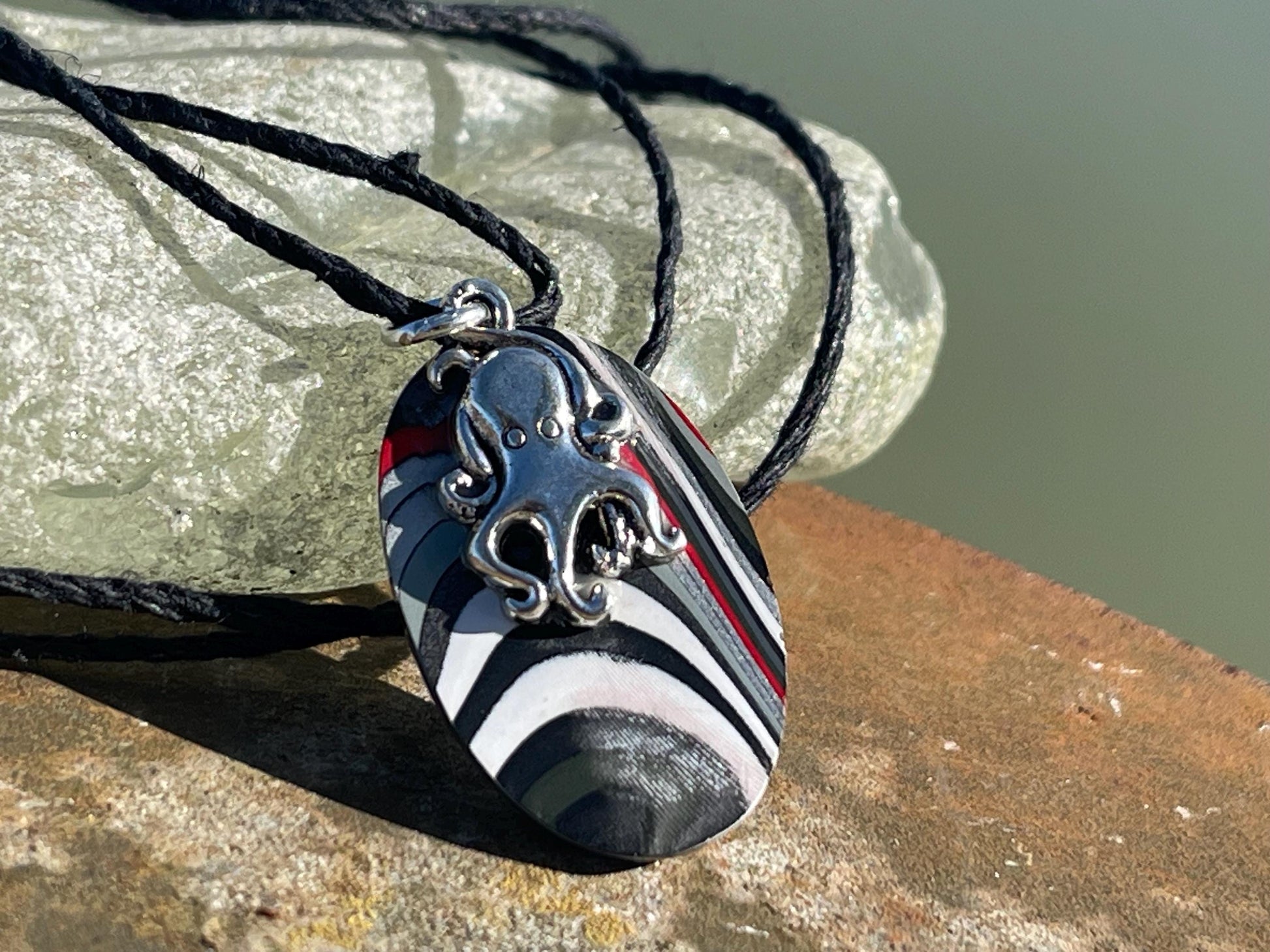 I have hosted the Fordite on a small silver plated octopus, situated to the back of the piece. It is held on sustainable hemp, left loose for you to hang at your desired length.