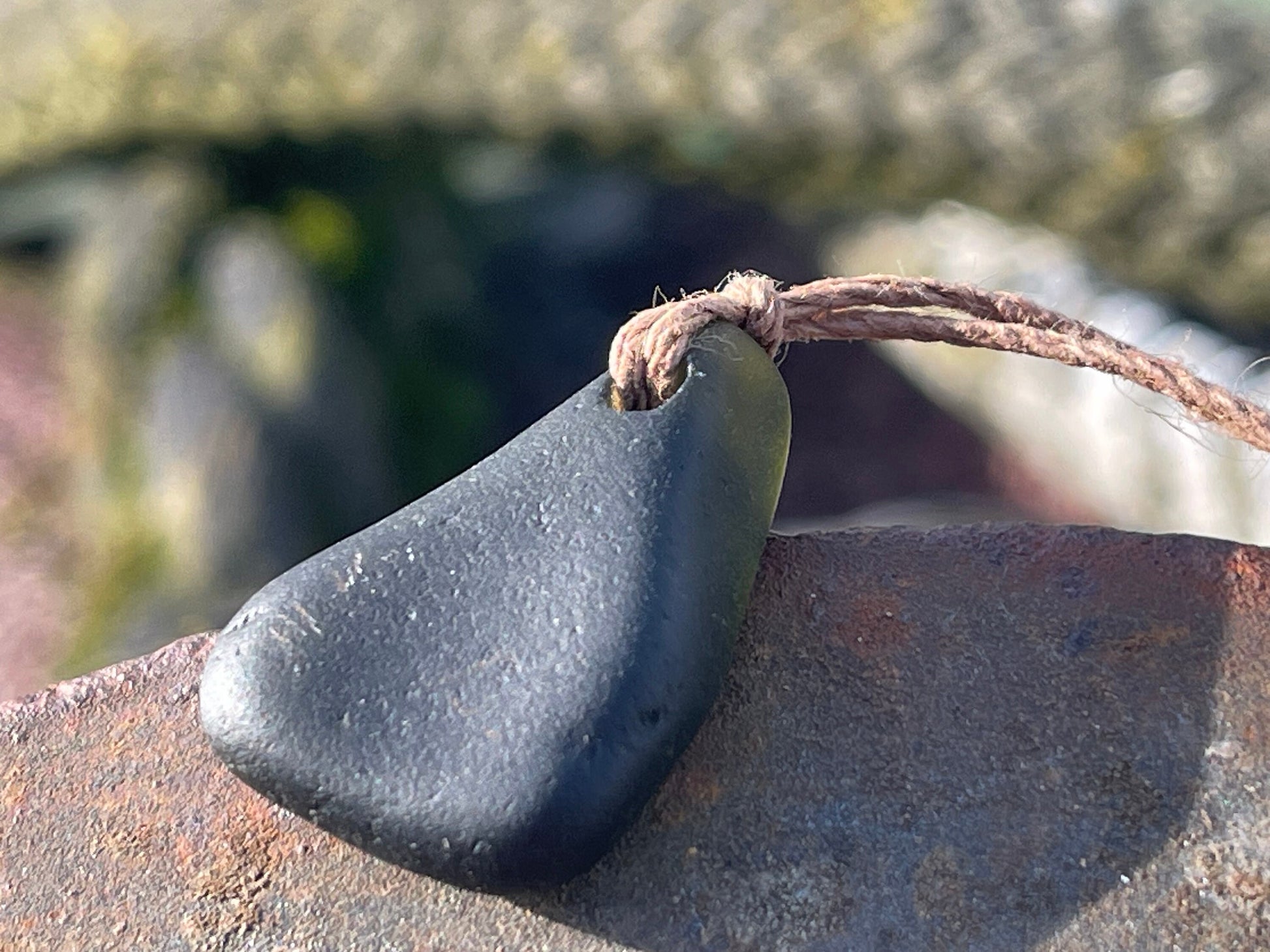 It is hung on sustainable hemp and can be worn in all conditions. It has been left loose to tie at your preferred length.