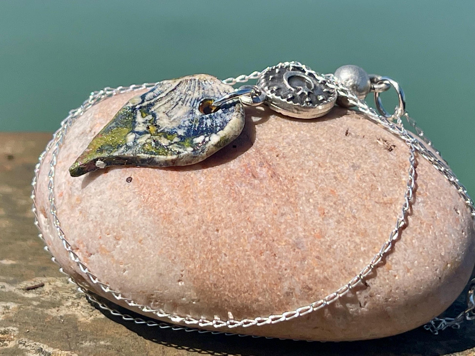 This pendant was created using hand formed Sussex Clay before being painted (using a mixture of underglazes) and fired.