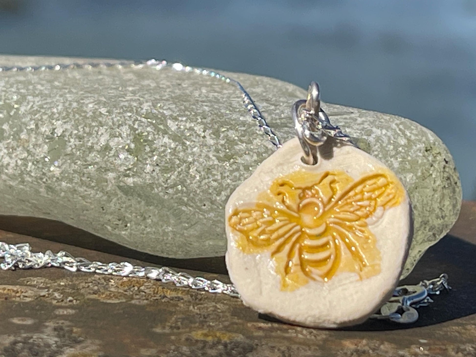 Handmade bee necklace. Eco friendly jewellery. Ethical pendants made with waste clay and recycled sterling silver. Ethical jewellery.