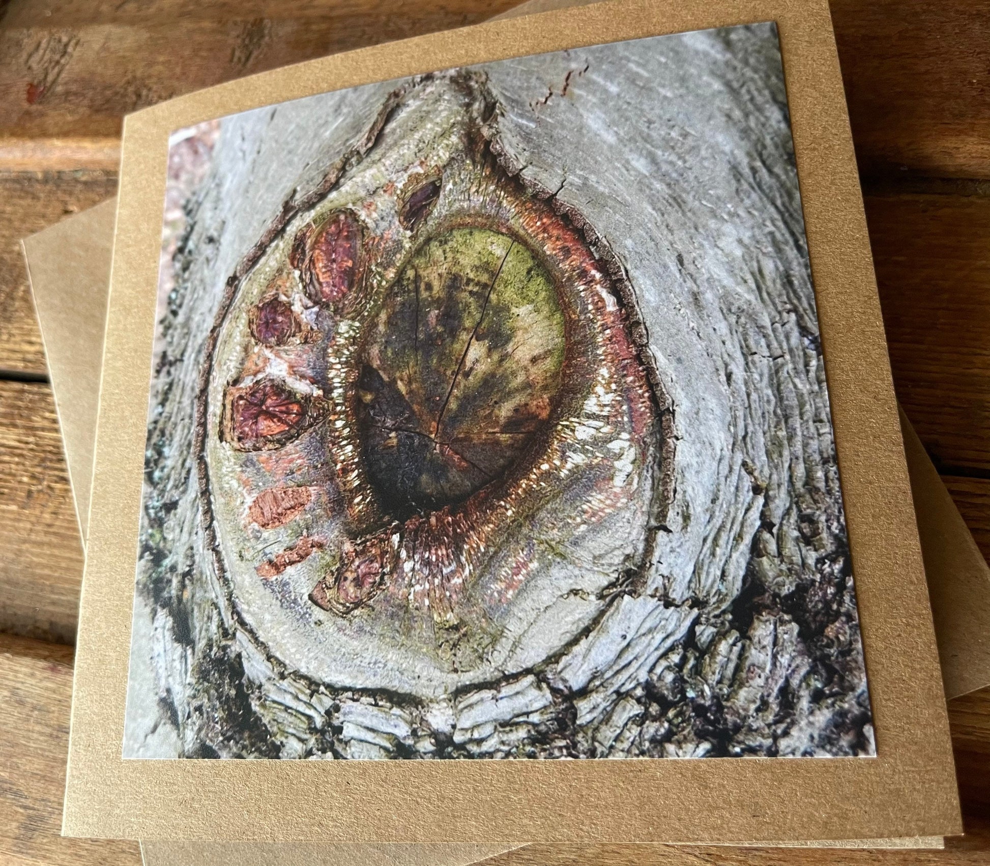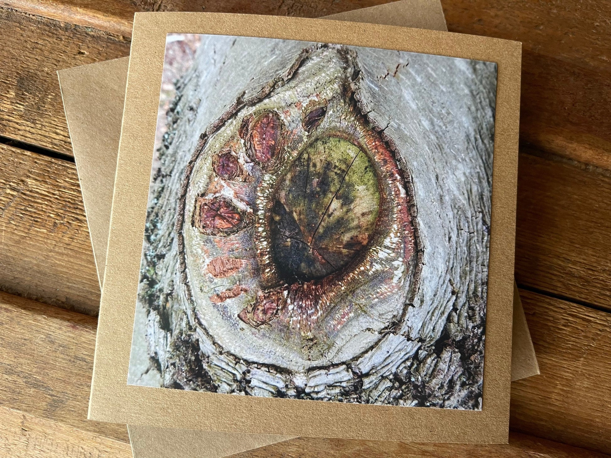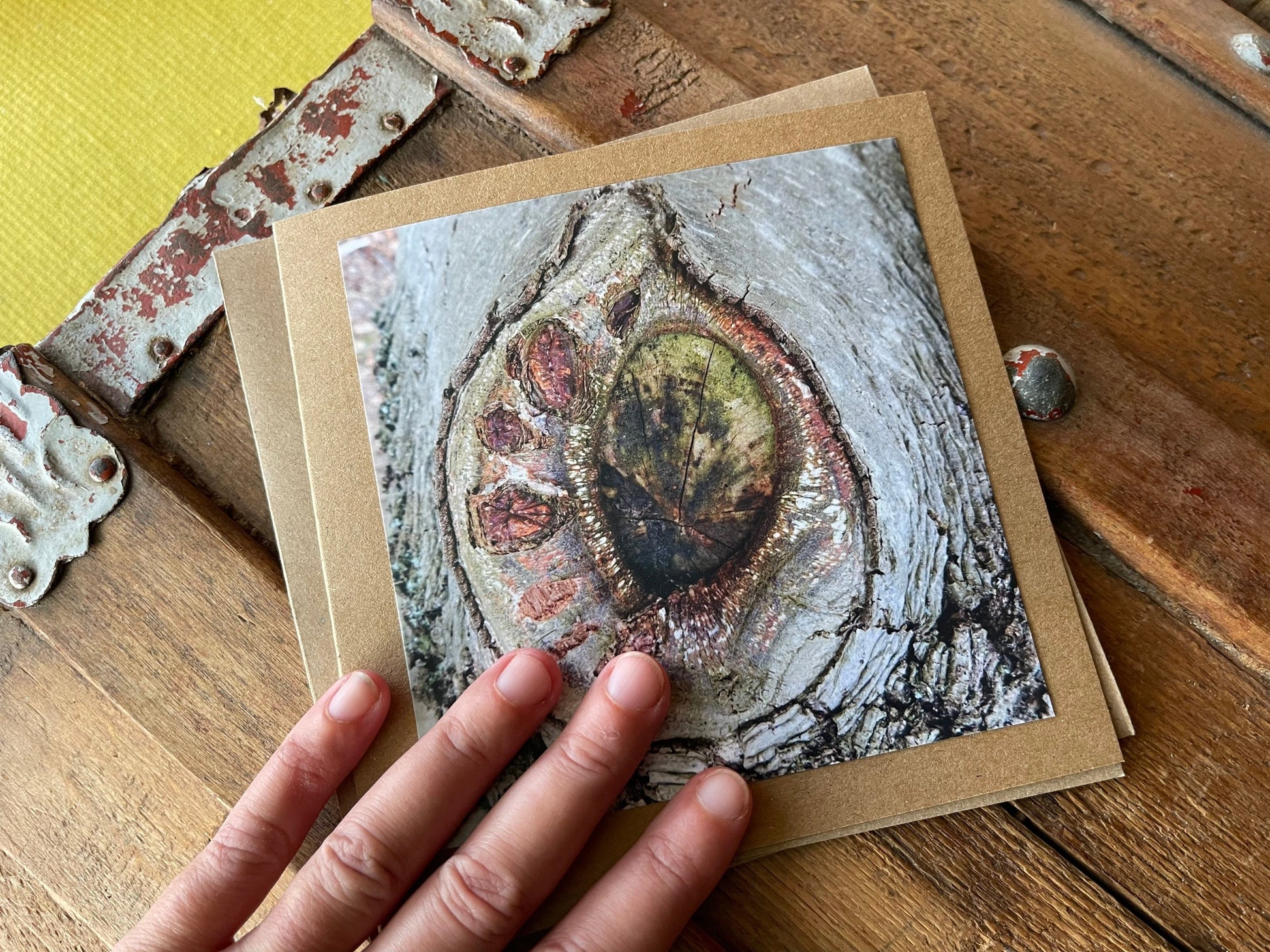 This recycled card features a photograph I took of a section of a very old tree. Beautiful formations in the bark :)