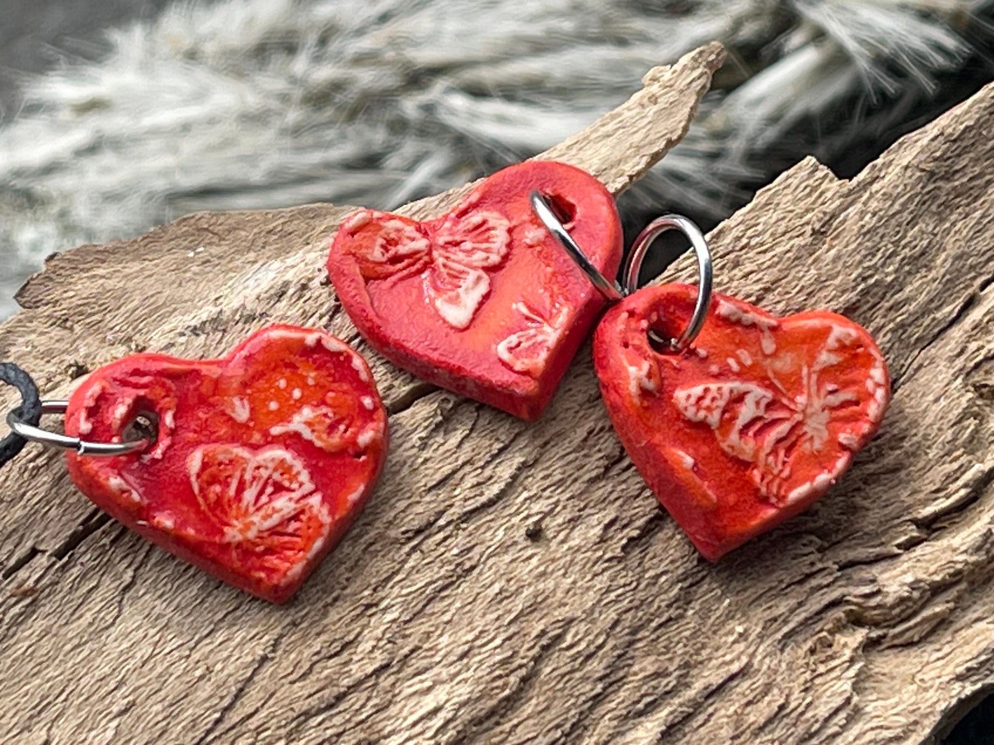 The hearts all vary a little as each one is hand formed and entirely unique. They are imprinted with small butterfly wing imprints and are hung on sustainable hemp.