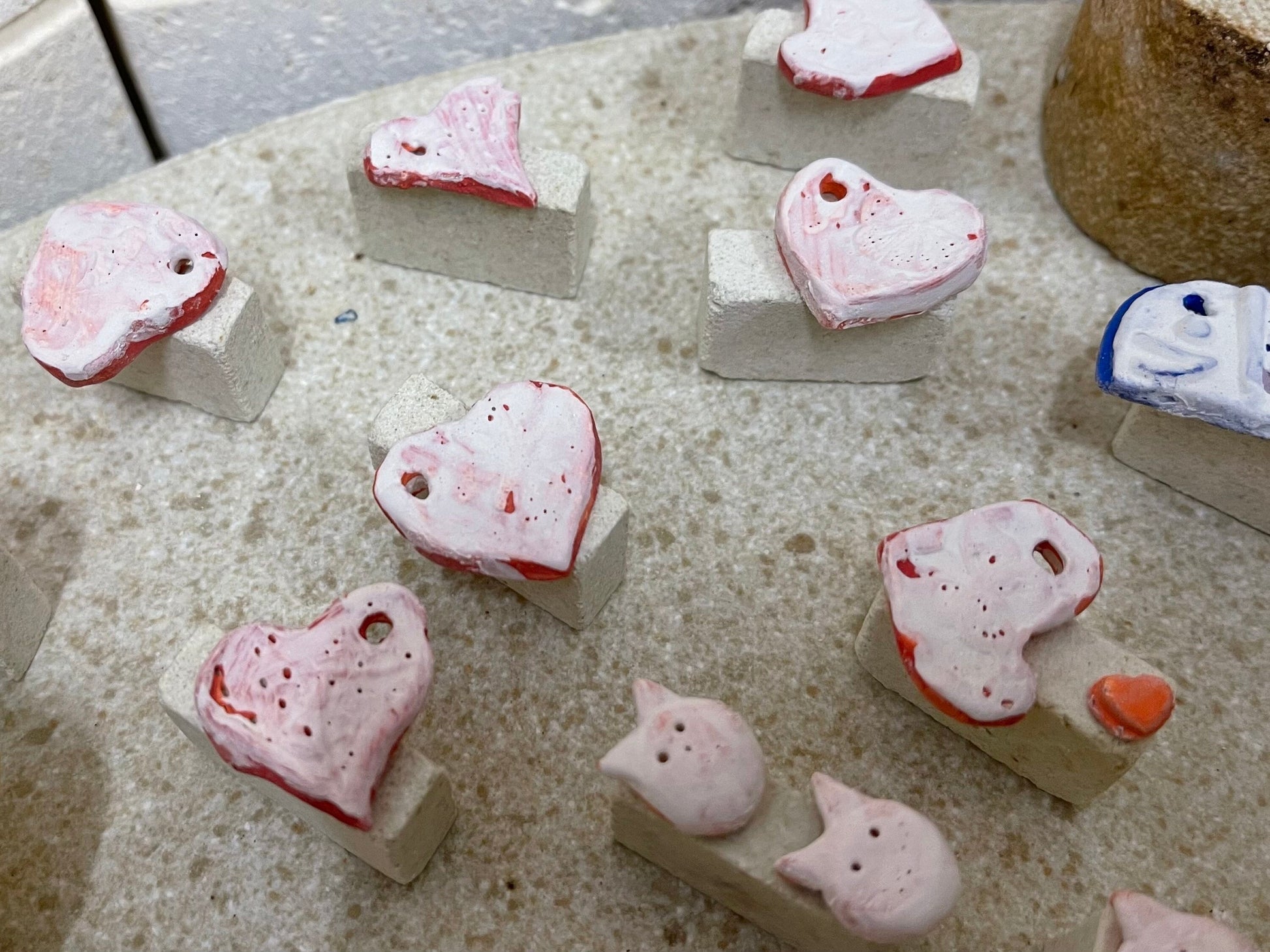 I created these hearts using off-cuts of Sussex clay and second hand glazes. They are double fired only when there is space available in a fellow artists kiln. All a little better for the environment.