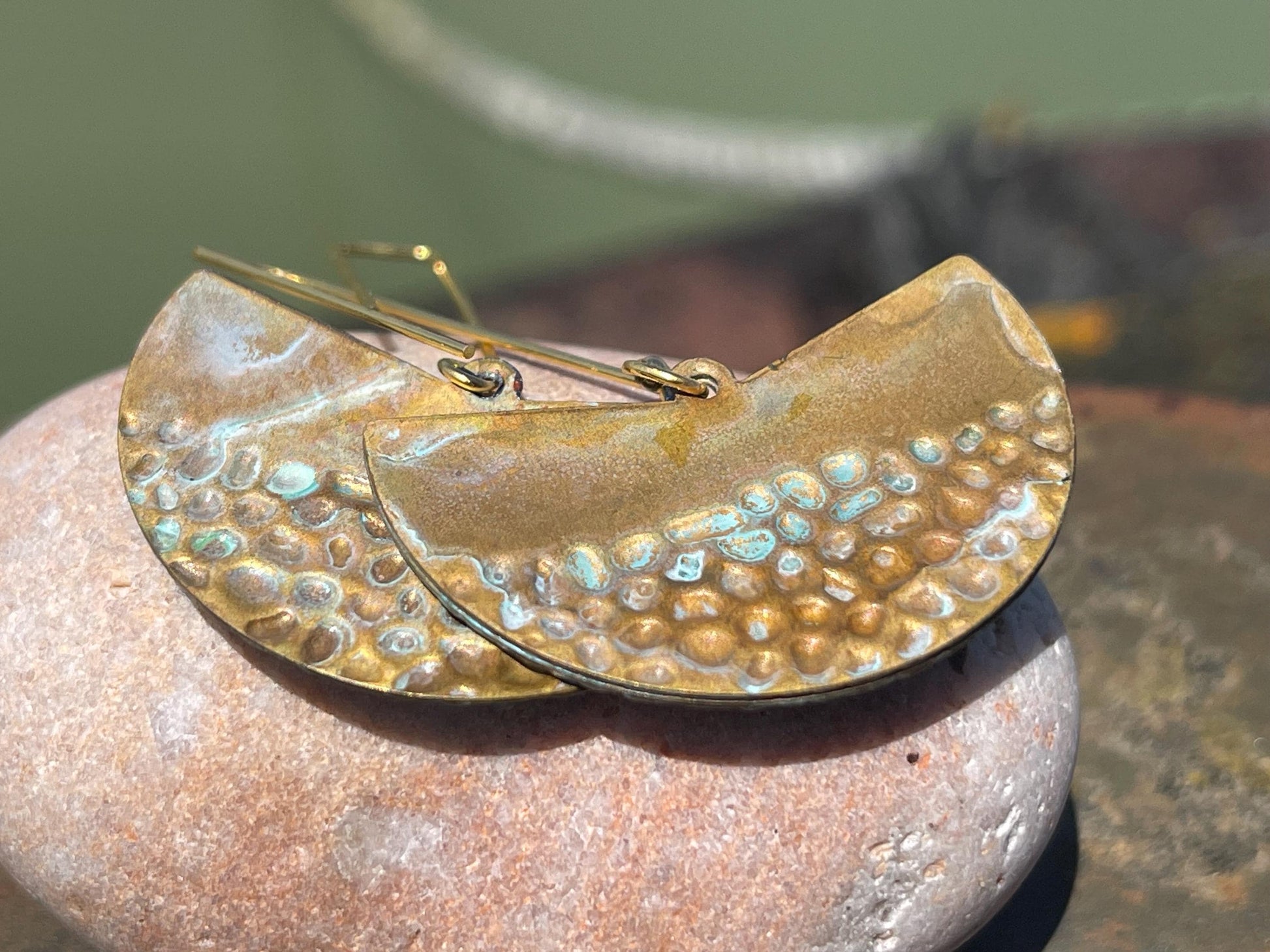 Showstopping earrings made from beaten brass that I have naturally patinered, painted and lightly varnished. They are held on recycled brass stems.