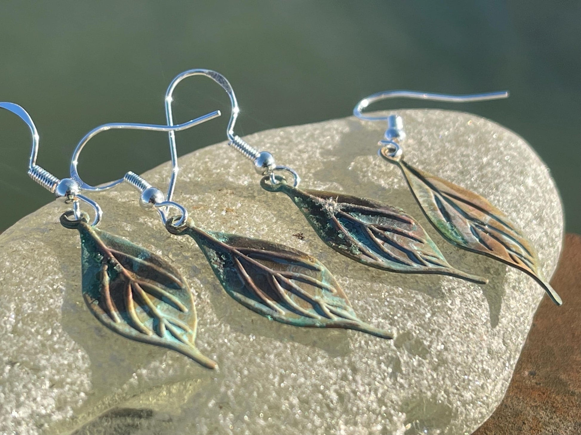 Stunning leaves that I have naturally patinered to reveal these beautiful shades of blue. They are hung on sterling silver ear hooks.