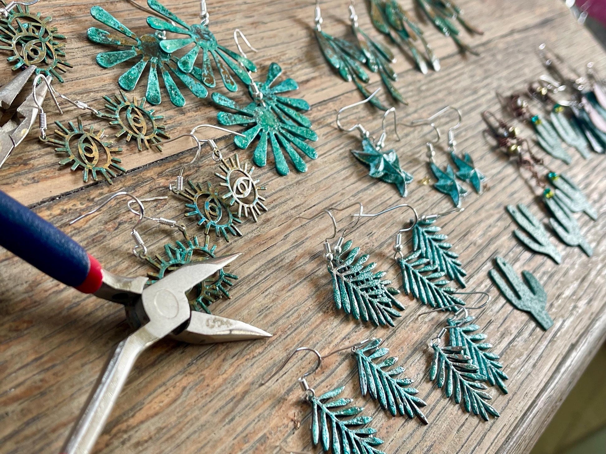 I create the patina slowly using natural and organic processes (with colours materialising slowly in the sunshine) and consequently, not one piece is exactly the same. Colours can vary a little, all part of the organic charm :) I have coated them in a light varnish.